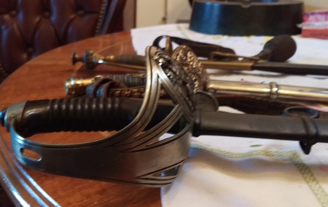 Das Stück mit der Lederscheide ist ein preußischer Infanterieoffizier-Degen alter Art, das Stück mit dem Tombakkorb ist ausweislich seines Wappens im Gefäß ein württembergischer Infanterieoffizier-Degen 89 und das dritte Stück ist ein preußischer Kavalleriedegen 89