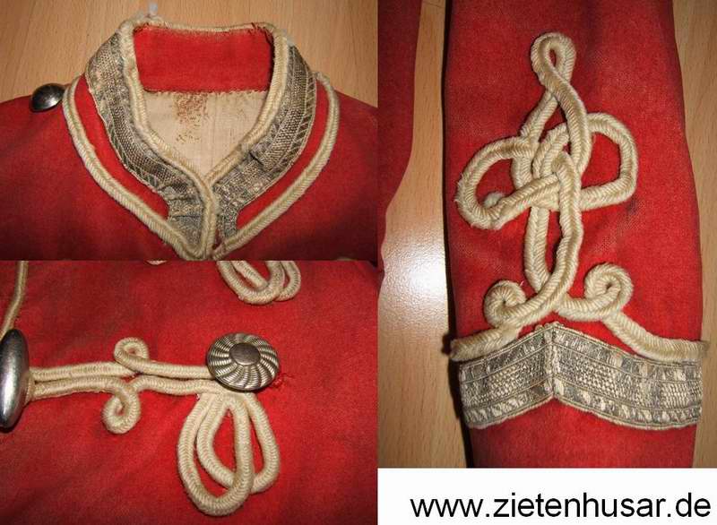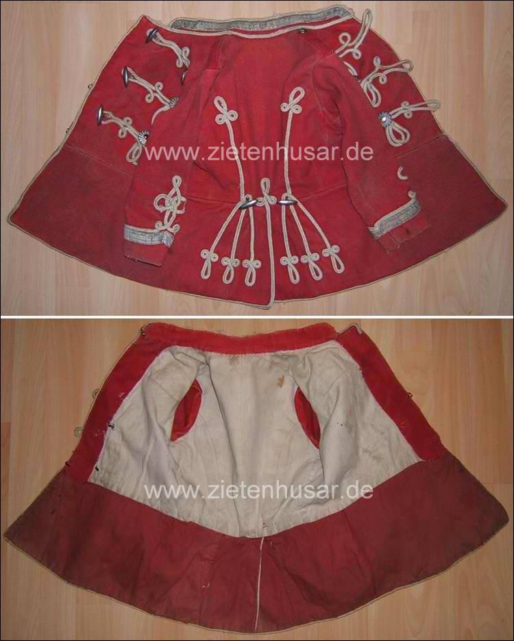 Ich bin mir bei der Zuordnung nicht sicher. Das Rot dieser kleinen Jacke (Unteroffizier?) hat einen anderen Touch als das Rot bei den Zietenhusaren. Allerdings kann das auch mit der Zeit gedunkelt, oder schon bei der Herstellung mit andersfarbigen (billigerem) Stoff gefertigt worden sein.