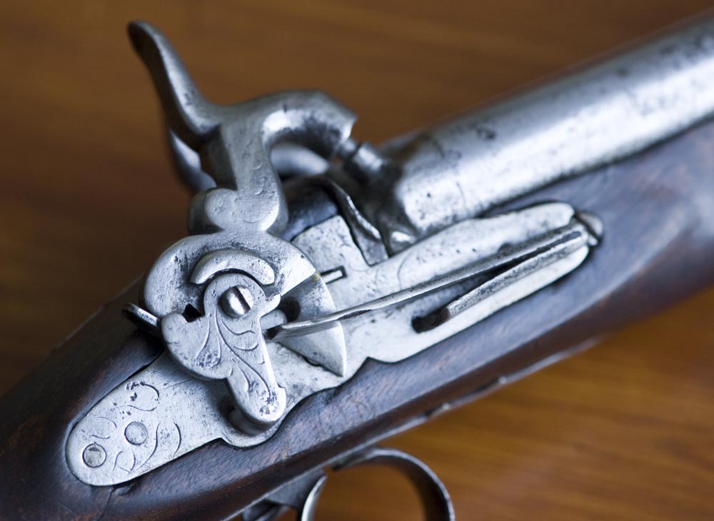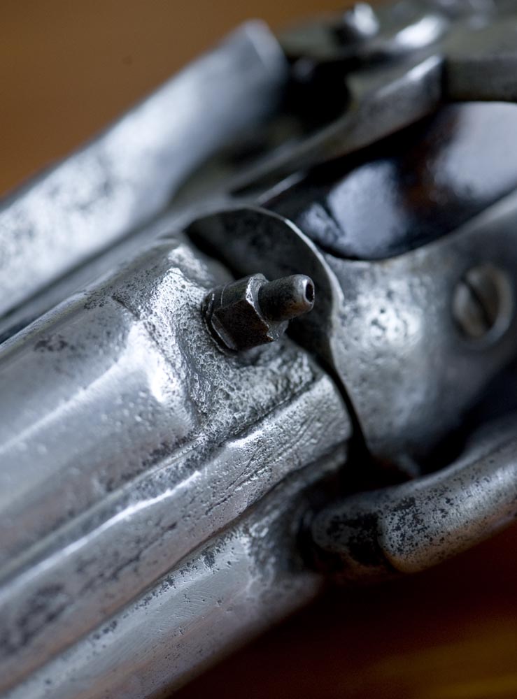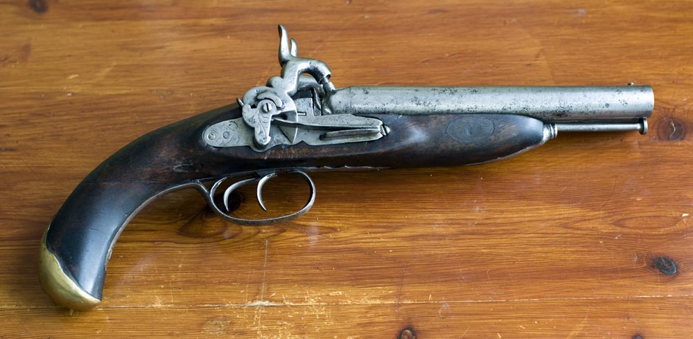 Zuerst ist festzustellen, dass die Pistole als Perkussionswaffe mit "Mehrschusseinrichtung" (Doppellauf) dem deutschen Waffengesetz unterliegt und erwerbscheinpflichtig ist. Ich hoffe für Sie, dass das Auktionshaus dies beim Verkauf berücksichtigt hat und die entsprechende staatliche Erlaubnis vorhanden ist.