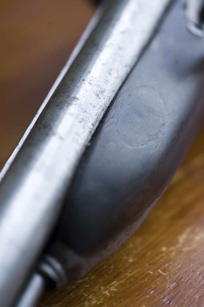 Die beiden ovalen Eindrücke beiderseits am Vorderschaft stammen von Messingunterlagen, die als Aufnahme eines Laufschiebers dienten, welcher in eine am Laufbündel unten angebrachte Öse eingriff und so den Lauf und Schaft verbunden hat. Dieser Schieber zusammen mit seinen Unterlagen wurde offensichtlich entfernt und duch einen einfachen Eisenstift ersetzt.