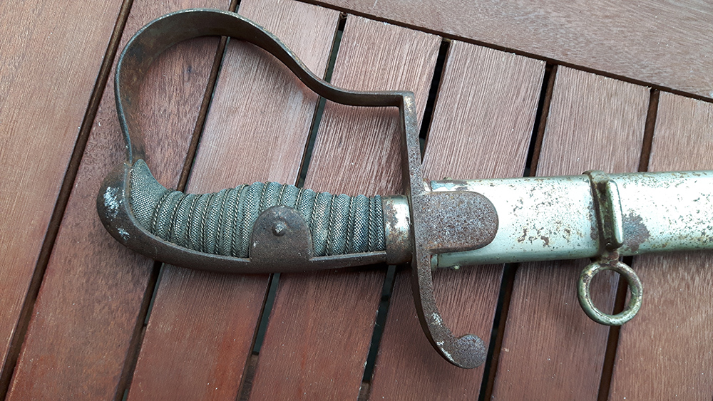 Nachdem wir uns im Jahr 2013 ein Haus gekauft haben, hatte ich nun endlich Zeit, alles mal ein bisschen auf Vordermann zu bringen. Auf dem obersten Regal in der Garage fand ich dann einen Säbel. Scheide wie Griff sind doch schon ziemlich vom Rost befallen, die Klinge selbst ist noch ziemlich gut, wenngleich auch noch mit ein paar kleinen rostigen Punkten versehen.