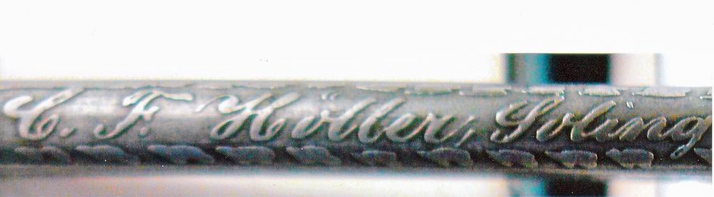 Interessant für mich ist, dass schon einmal über einen Säbel mit der Signatur: C. F. Höller in Solingen diskutiert wurde. Es fällt allerdings auf, dass die Schriftart sich von der auf meinem Säbel unterscheidet. Kann das darauf hindeuten, dass die Säbel jeweils als Einzelstücke in Auftrag gegeben wurden? In einem anderen Beitrag habe ich gelesen, dass bei der Einzelherstellung von Säbeln auch die Mode und das künstlerische Empfinden des Klingenherstellers und des Käufers mitspielen, wenn es sich nicht um eine detailliert reglementierte Ordonnanzwaffe, sondern um privat beschaffte Stücke handelt. Um in der Sache C.F. Höller weiter zu kommen, müsste man wohl in den Archivunterlagen zur Unternehmerfamilie