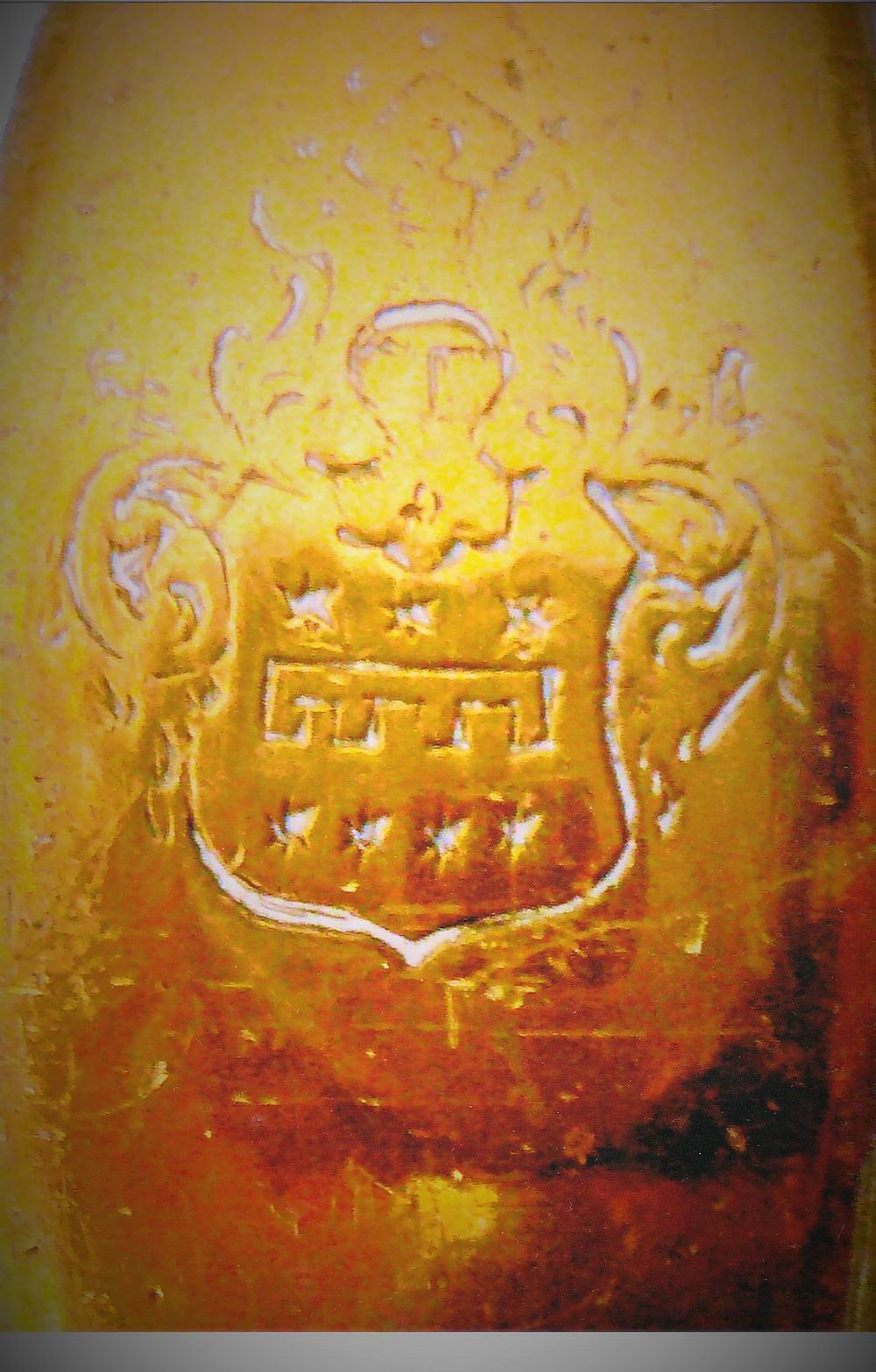 Auf den Parierlappen sind keine Gravuren. Offen ist, was das Wappen mit dem vierlatzigen Turnierkragen auf der Rückseite der Montur zu bedeuten hat. Die Symbolik der darüber (leider nur schlecht) sichtbaren Gravur kann ich nicht deuten. Könnte es ein Bär sein? Gibt es dazu Anhaltspunkte oder Erfahrungen?