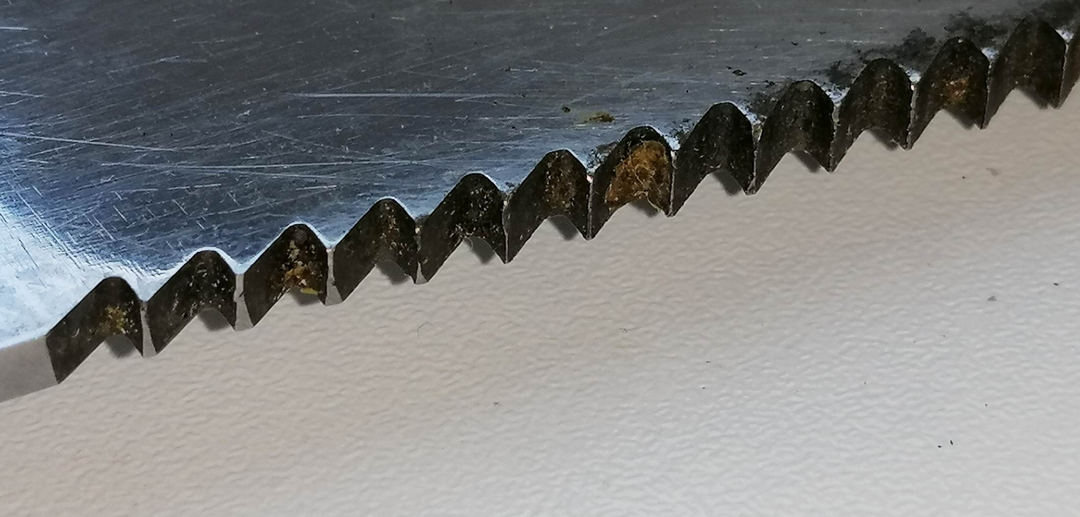 Dieses Mal konnte ich eines mit Säge und Scheide ergattern. Die Klinge sieht so gar noch recht gut aus, aber leider wurde es vom Kompass oder von der Knauffüllung "befreit".