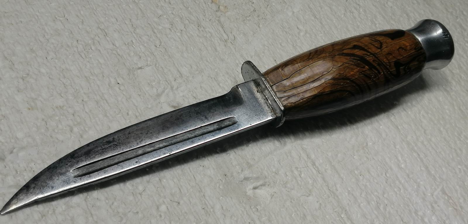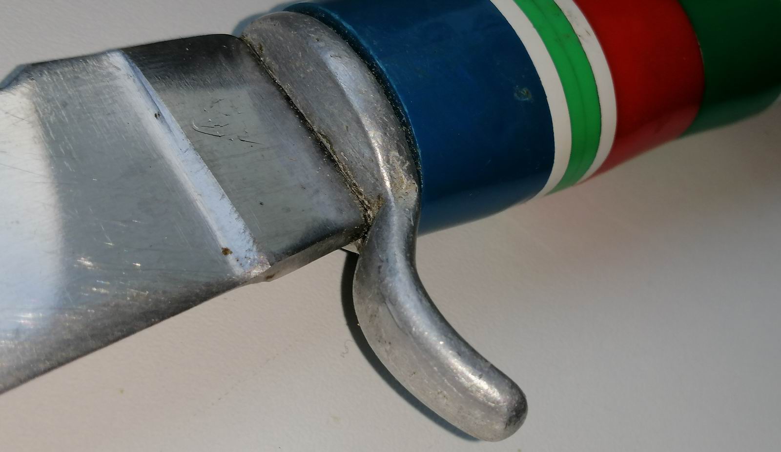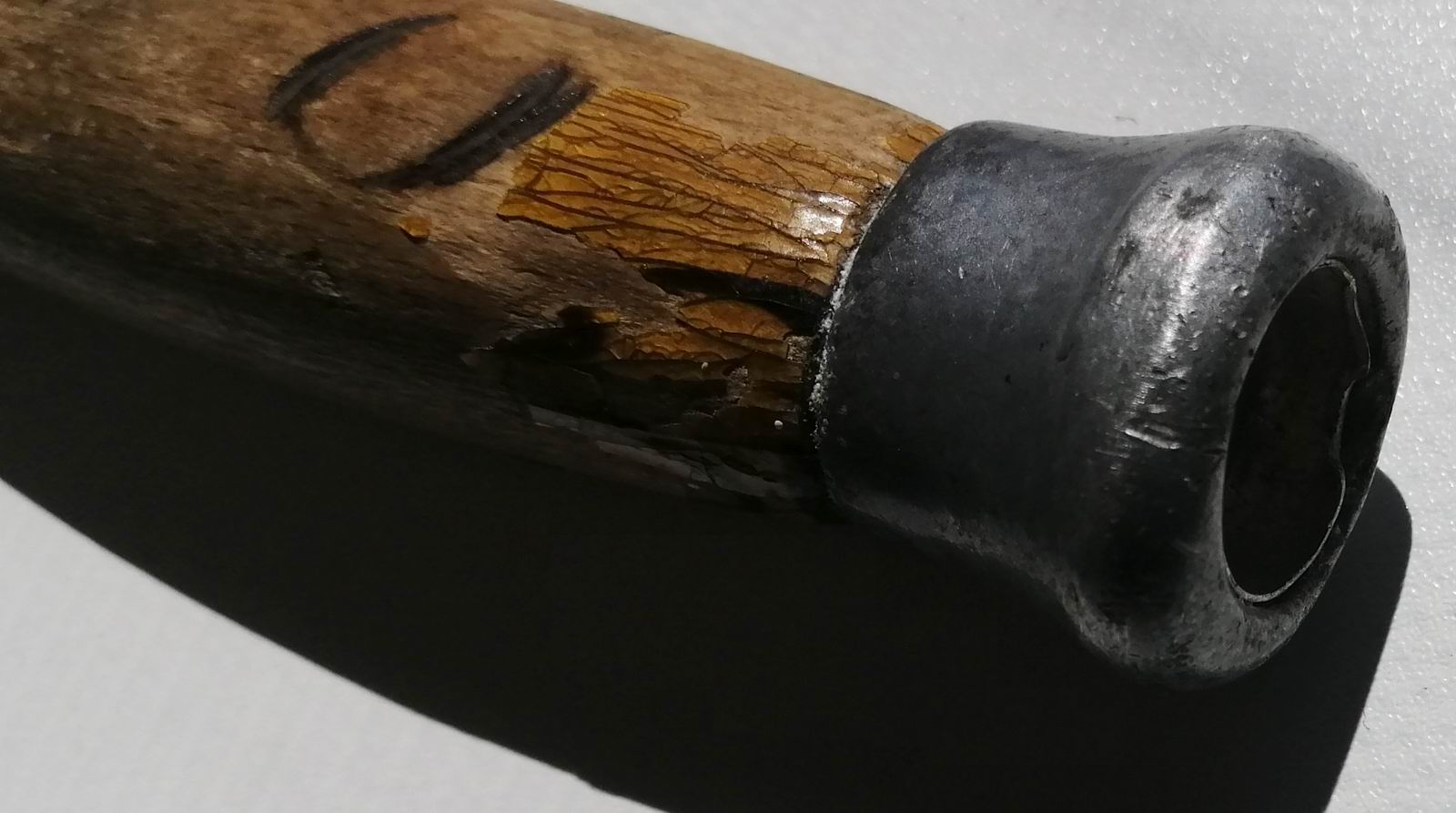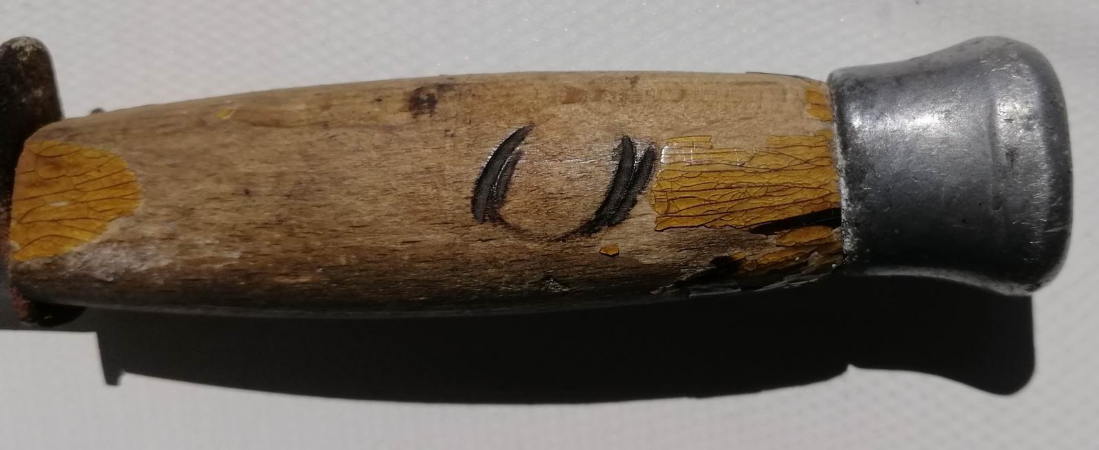 Dieses Mal kein Flohmarktfund, sondern ein sonntagmorgendliches Gespräch mit dem Nachbarn an der Mauer. Dabei habe ich Einblick auf einige Zentimeter in seiner Garage. Hinterm Stromkabel stach das unten abgebildete Messer. Die Klinge angeschliffen, der Lack vom Griff fast vollständig verloren, Einbrand in der Hilze, ohne Scheide, Kompass ist weg und das Parierelement rostig. Ein bisschen so kaputt wie ich. :D