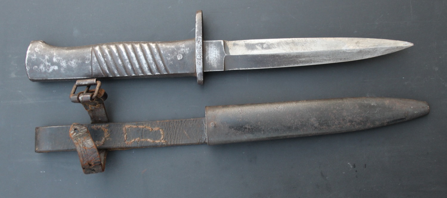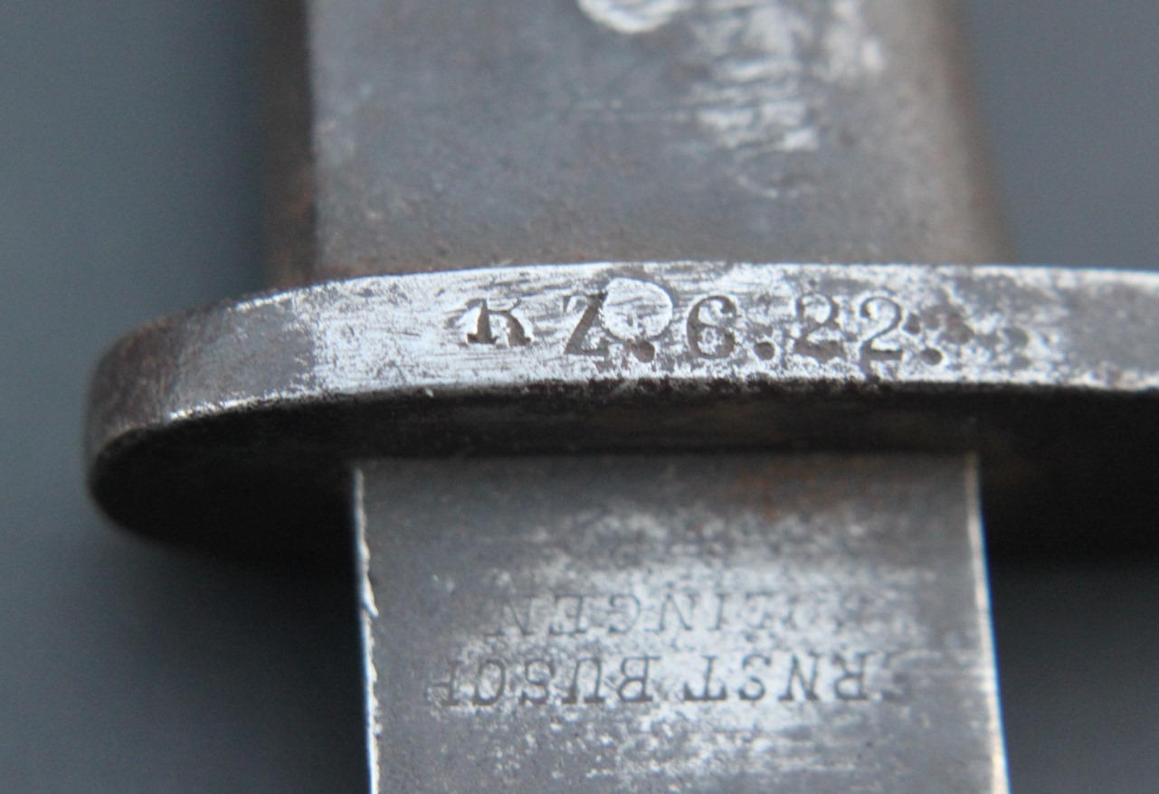 Es handelt sich um einen abgenommenen Grabendolch des Herstellers Ernst Busch. Der Truppenstempel ist quartseitig auf der Parierstange wie bei einem Seitengewehr angebracht.