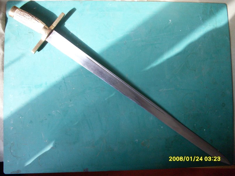 ich suche Hilfe um dieses Stück ein Gesicht zu geben.Ich erhoffe mir mit Hilfe der Stempelung eine Lösung.Leider ist sie nicht eindeutig zu lesen es könnte 2.T.5P.38 oder 2.T.5R.38 lauten.Ich schätze die Herstellungszeit um 1850,er hat Ähnlichkeit.mit dem Sächsischen Modell 1820 seine Stempelung deuten auf eine militärische Verwendung sie könnte auch paramilitärisch sein.Hersteller musste die Firma Krebs in Solingen sein ist schlecht lesbar ,aber da diese bis nach 1900 produzierte ist dieser Hinweis keine große Hilfe