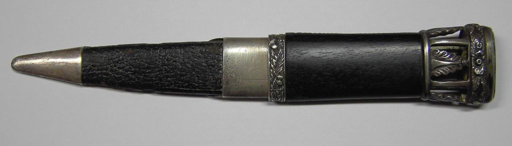 Das gezeigte Stück hat einen Ebenholzgriff mit typischem Zopfmuster an der Terzseite. Die durchbrochene Krone und die Beschläge der Lederscheide sind aus Silber. Als Abschluss der Krone nach oben dient ein orangefarbener Quarz aus den schottischen Cairngorm Mountains. Träger war vermutlich ein ehemaliger Angehöriger des Gordon Highlanders' Regiments. Die gerade Rückenklinge ist sehr scharf geschliffen und zeigt am Rücken die für diese Waffe charakteristischen Kerben