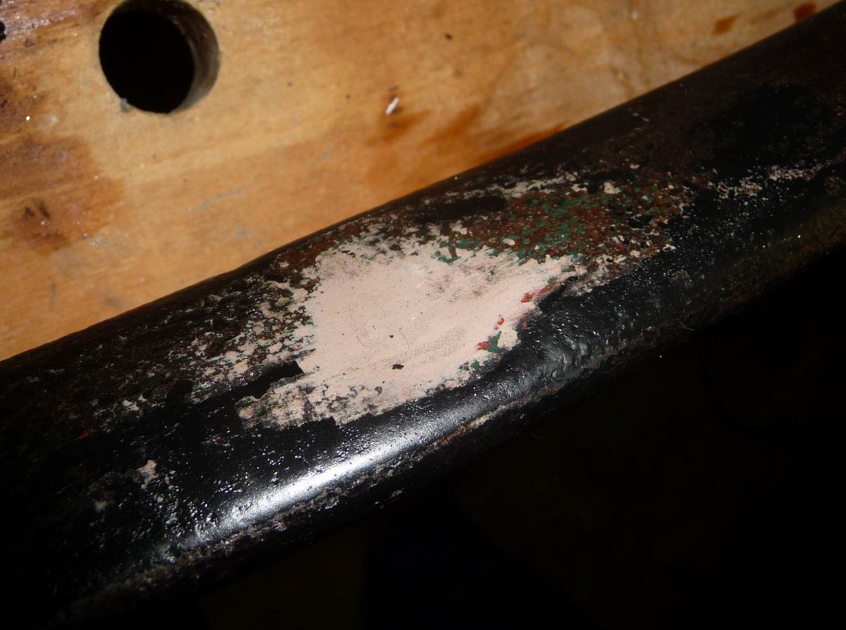Unter der Farbe der Scheide kamen drei gespachtelte Stellen zutage (siehe letztes Foto). Zwei Dellen und ein Loch wurden auf diese Weise "repariert". Den Abbeizer habe ich nach längerer Einweichzeit abgewischt, dann Spachtelmasse und Restfarbe mit einem Propangasbrenner abgeflammt. Anschließend mit einer Drahtbürste entstaubt. und satt eingeölt. Nun ist sie zwar ganzflächig rostnarbig, dellig und mit einem Loch im Schleppblechbereich, aber ohne Verschlimmbesserungen.
