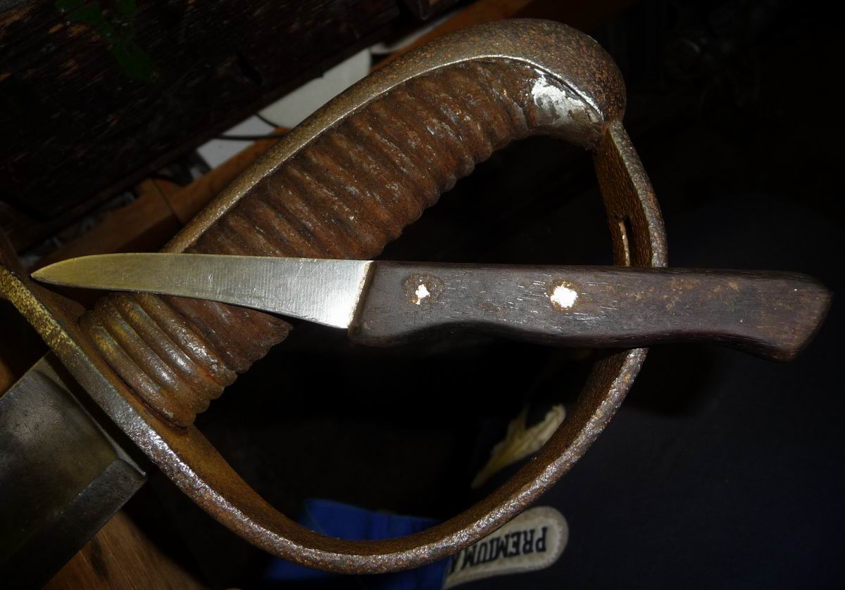 So eine ähnliche Geschichte hatte ich mal mit einem alten Husarensäbel( gefunden ,glaub ich Kemberg oder Kempberg komplett mit Uniform..usw.)nur das er vom liegen fast auseinander gefallen war. Scheide war aus Leder und die Klinge war mit POTZDAM gemarkt ( Adlerstempel)