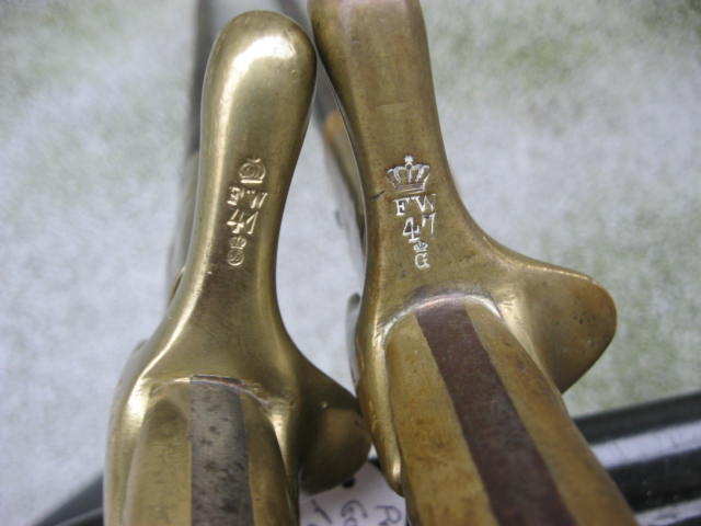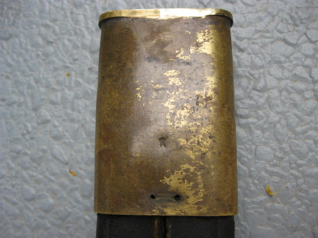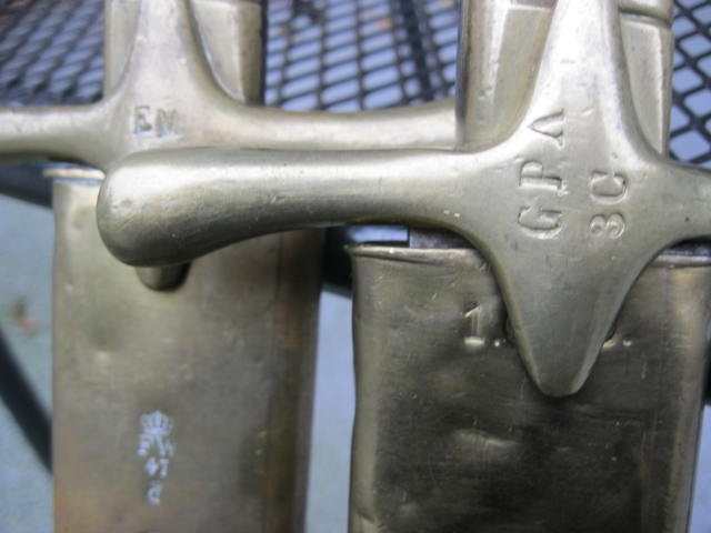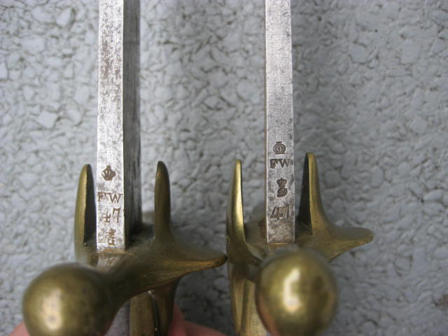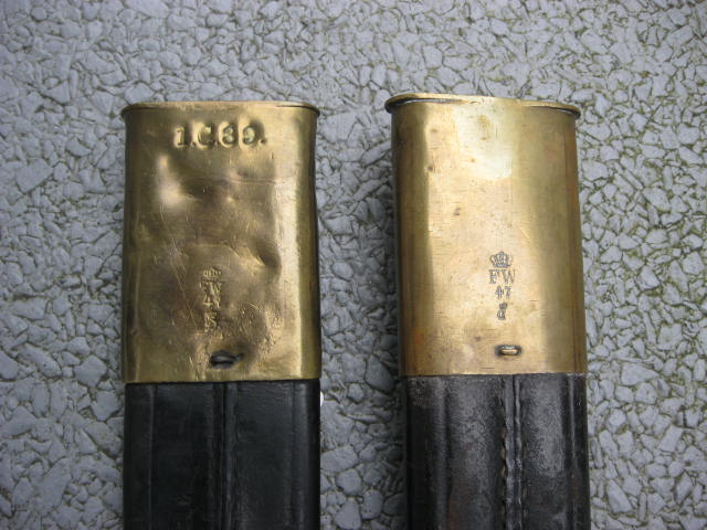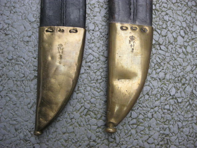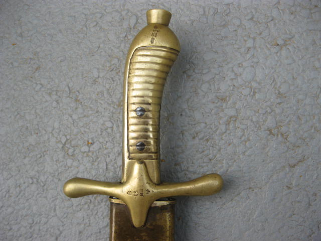 Bei diesem Stück wanderten die Abnahmestempel auf die Quartseite der Parierstange,wo meist auch der Einheitstempel zu finden ist,der hier fehlt.Desweiteren hat die Scheide nur Krone u.Buchstabe als Abnahme.