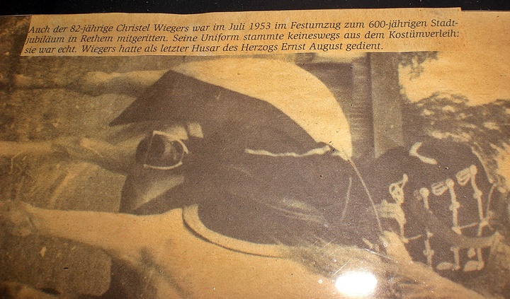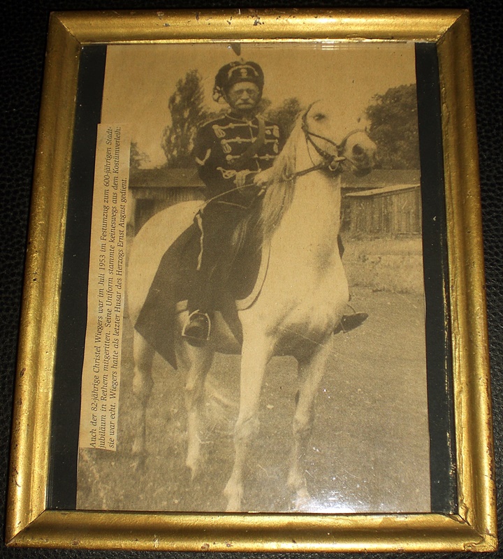 zur Ansicht, mein gerahmter Zeitungsausschnitt zu Ehren des ehem. Husaren Christel Wiegers, Juli 1953 in Rethem / Aller. Als 82-jähriger, zum 600-jährigen Stadtjubiläum im Festumzug mitgeritten. Chr. Wiegers, hatte im Husaren - Regiment 17 des Herzogs Ernst August, in Braunschweig gedient. Gruß, sonjar