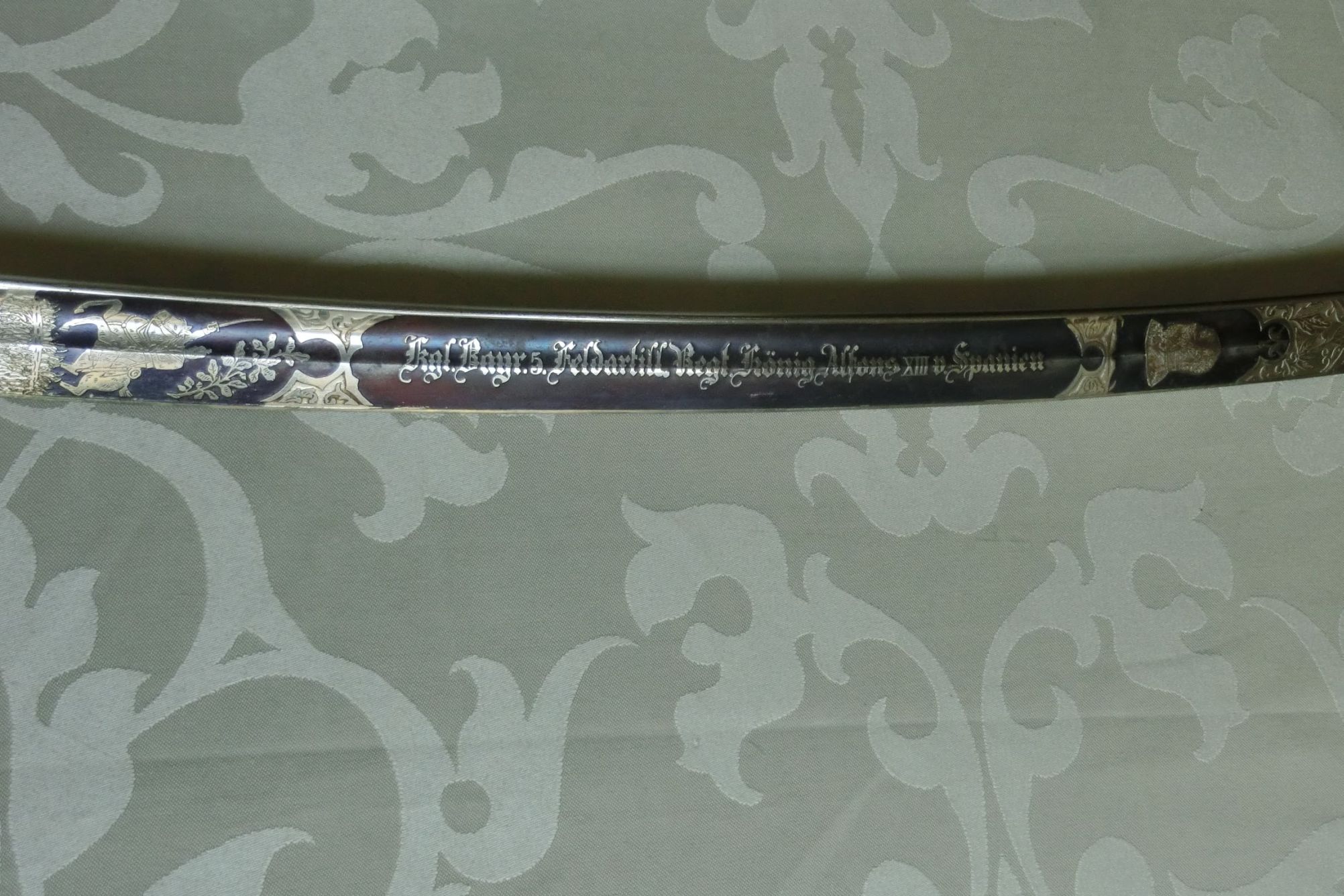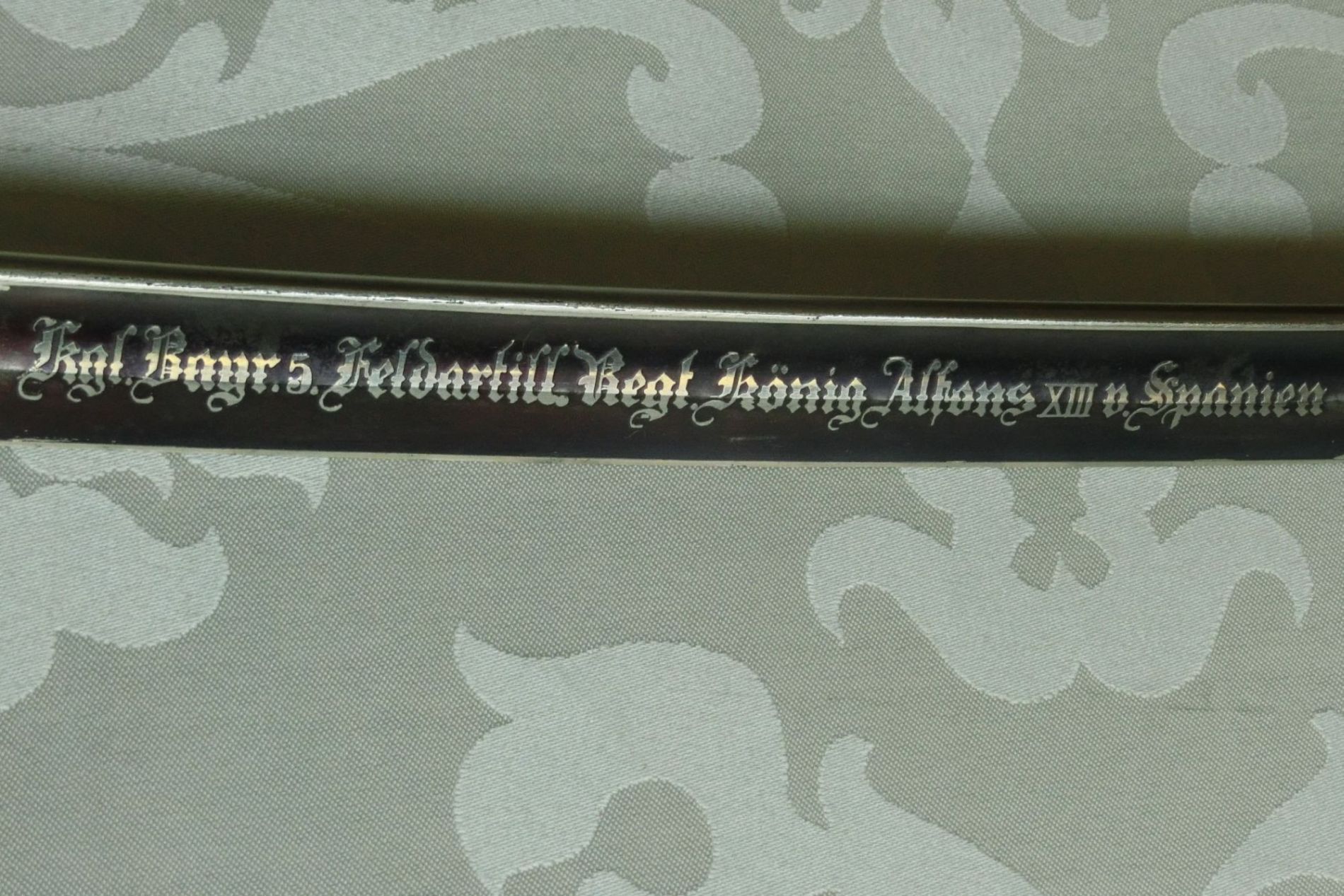Das Stück ist ein bayerischer Artilleriesäbel, welcher im Gegensatz zum dienstlich verausgabten ähnlichen, aber schweren Säbel privat erworben und nur außerdienstlich angelegt wurde. Als Eigentumsstück verblieb es natürlich auch nach der Dienstzeit im Besitz des betreffenden Soldaten.