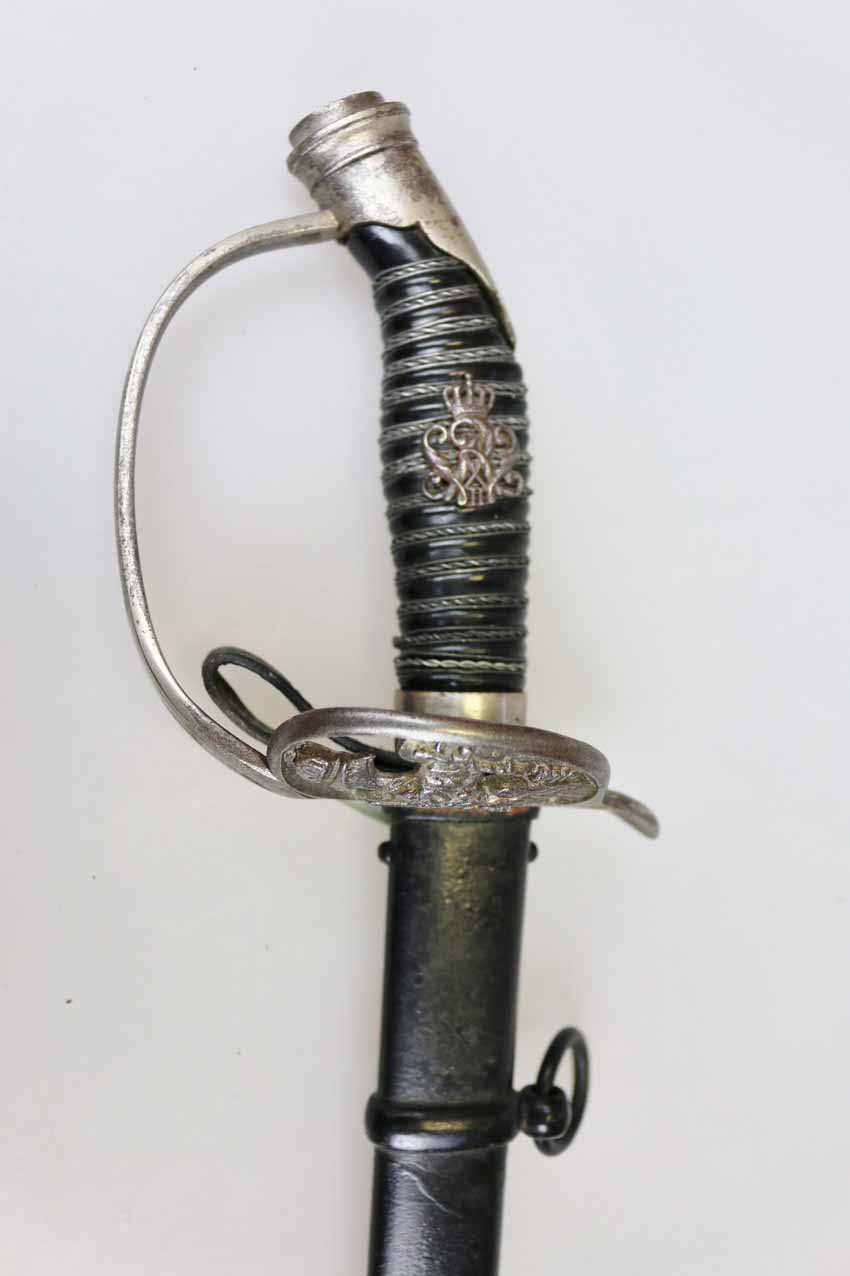 Der hier vorgestellte Degen ist durch den kunststoffbezogenen Griff und durch das Fehlen des Trichtermundblechs – hier wurde nur ein einfaches Deckplattenmundstück verwandt – eine späte Kriegs- oder sogar Nachkriegsfertigung. Vom Bauchgefühl würde ich eher darauf tippen, da hier eine geschwärzte Eisenausführung aufgefrischt wurde. Möglicherweise war das Gefäß auch zwecks Rostschutz vernickelt und und erst danach geschwärzt.