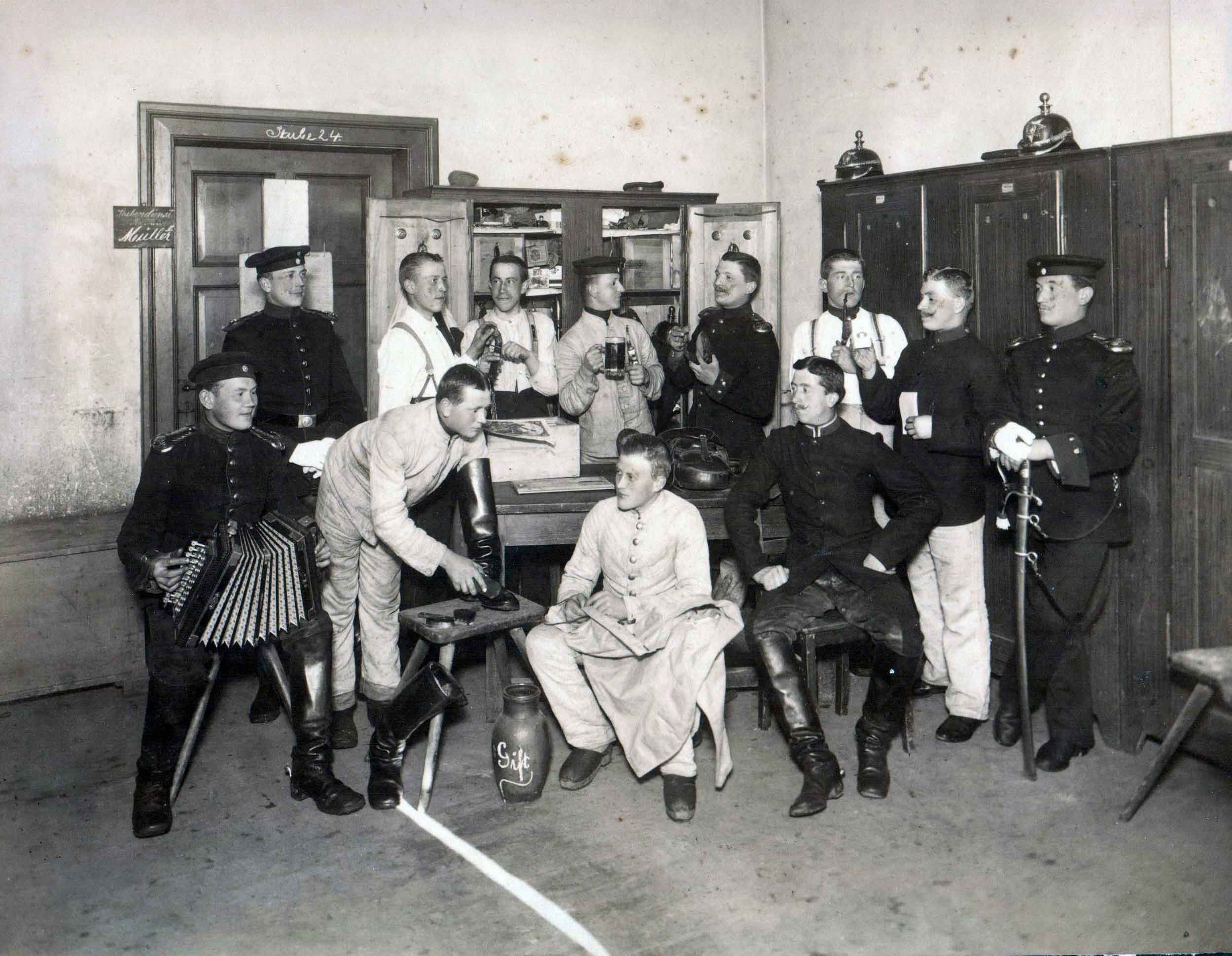 Stubendienst bei einem sächsischen Artillerie-Regiment. Die Aufnahme läßt sich relativ stark vergrößern, so daß auch Details der Spinde sichtbar sind.