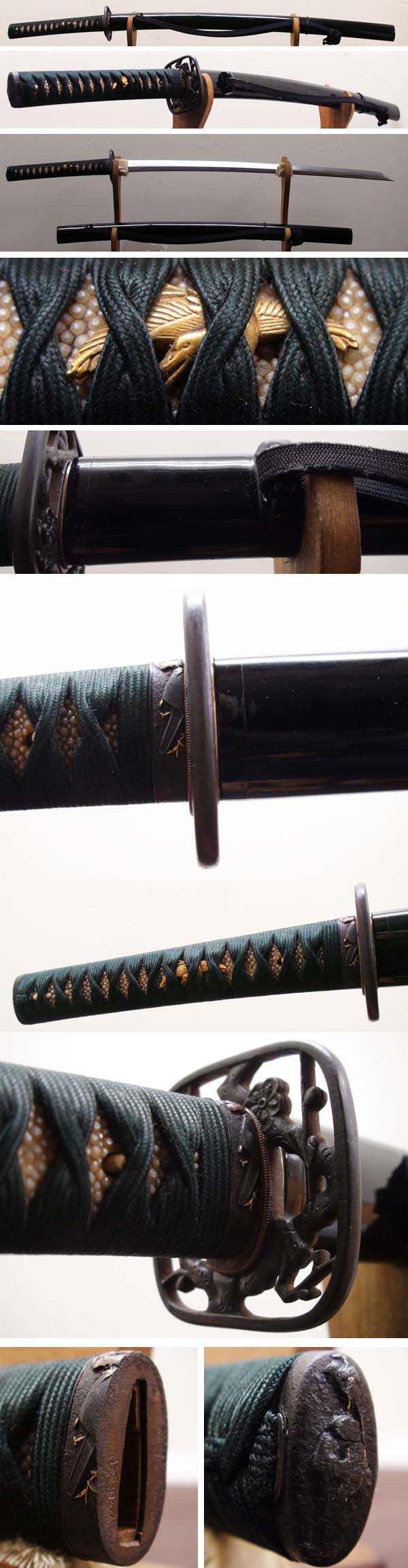 Koshirae: Elegante, antike uchigatana-Montierung aus der Edo-Zeit mit komplettem Griff, Tsuba und Saya wie abgebildet. dunkelgrüne Seidenwicklung. Fuchi Kashira Eisen mit Landschaft und Pflanzen im Relief, teilweise mit Gold nunome, signiert. Menuki Gänse in Gold. Eckiges Sukashi-Eisentsuba, Zweige mit Pflaumenblüten. Saya mit Sageo, schwarze Lackarbeit.