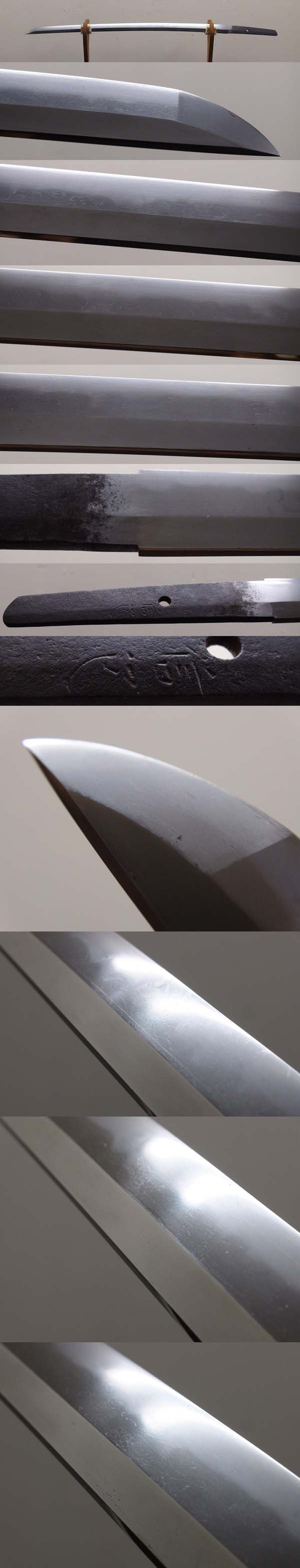 Klinge: 61cm, shinogi zukuri, sori 1cm, motohaba 2,87 cm, kasane: 5,6mm, chu kissaki, itame hada mit mokume, komaru boshi, gunome midare hamon mit choji, ubu nakago, 1 mekugi ana, signiert: "NOBUKANE", mit Papier der NTKS (NIHONTO KANTEI SHINSAKAI), gute Politur, Klinge in gutem Zustand, Nobutaka-Schule, Owari-Provinz, um 1700.