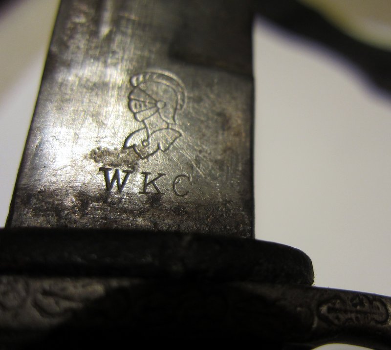 Seitengewehre dieser Art wurden häufig im 1.Weltkrieg von Offizieren getragen. Auf dem Griff preußischer Offiziere war oft das Monogramm WR II, wie am IOD89. Das Monogramm ohne Ziffern weist auf den Würtembergischen König Wilhelm II.