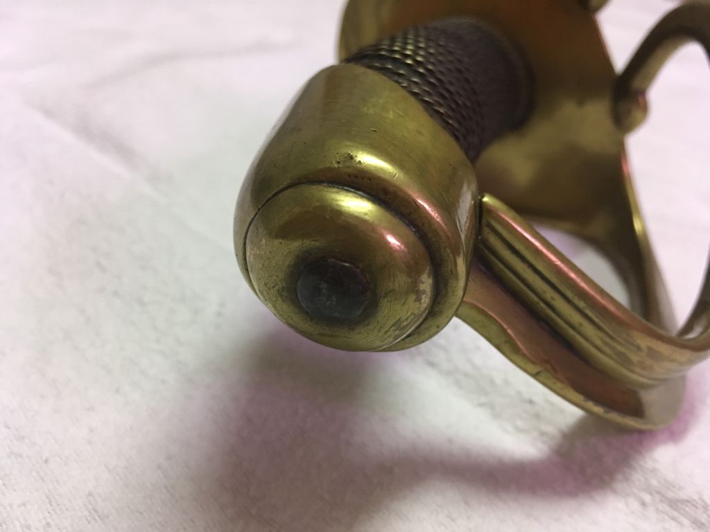 Interessant ist die Griffkappe. Von einem älteren Sammler, der vor Jahrzehnten mit einem noch lebenden Kürassier der “alten Armee” sprechen konnte, wurde mir erzählt, dass die rückseitigen Griffkappen wohl öfters (ob offiziell oder “halb-offiziell”) bewußt abgeschliffen wurden, angeblich weil man sich beim Exerzieren / Blankziehen des Degens an deren Kanten die Hände verletzte. Man findet das oft beim sog. “Sondermodell GdC”; dort ist es schon fast die Regel.