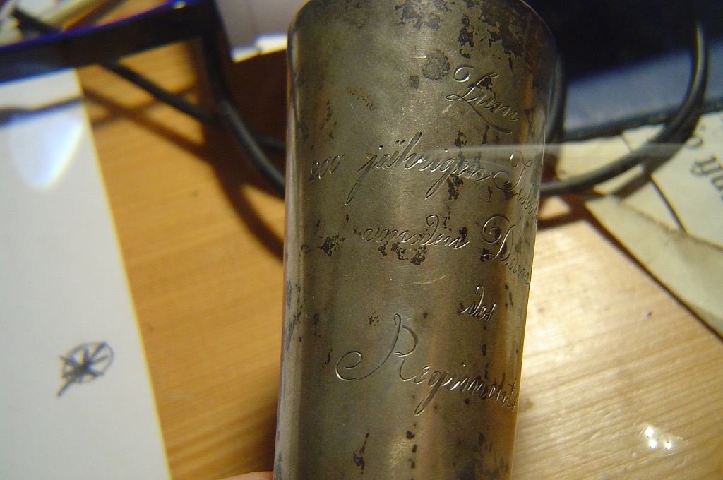Was noch angemerkt werden kann ist, dass der Becher selbst älter sein kann als die Gravur. Zu der Zeit als die Regimenter ihre 200. Jahresfeiern begingen war Silber auch nicht gerade für den ganz schmalen Taler erhältlich.