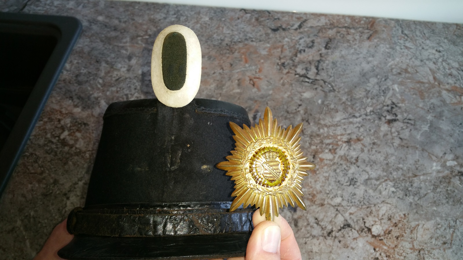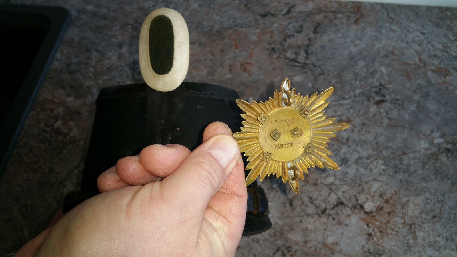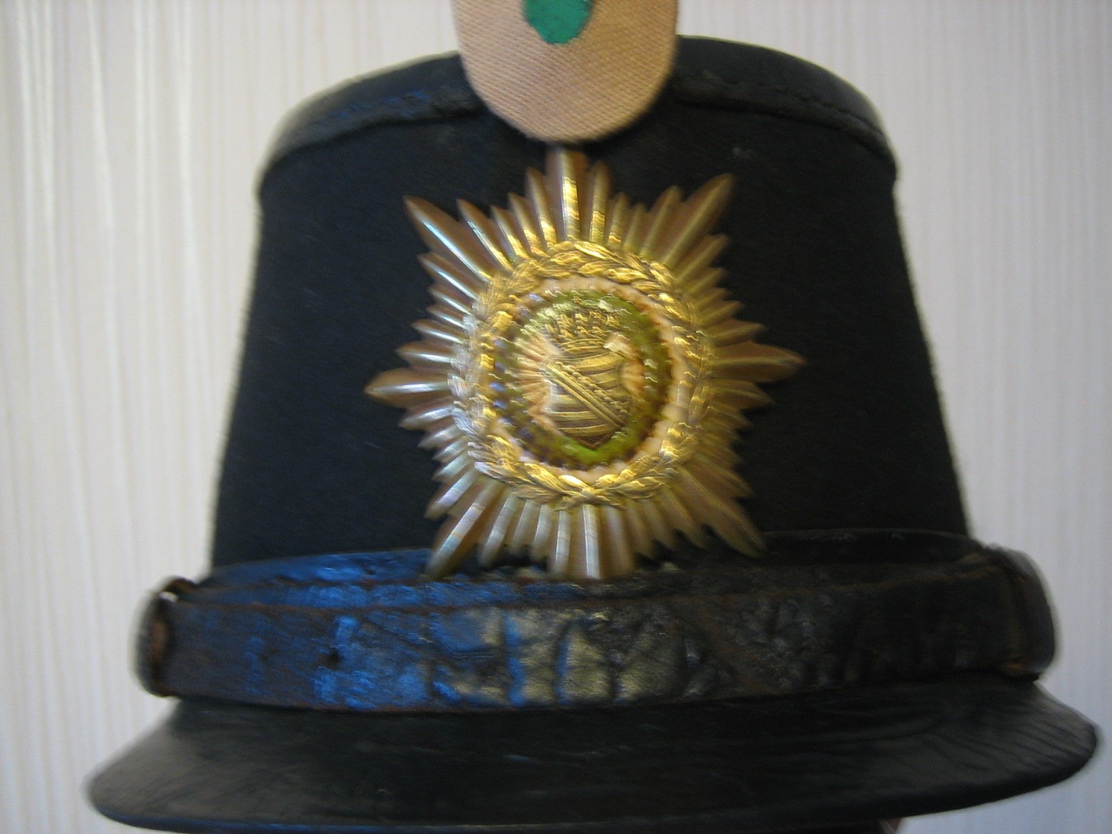 1903 wurde für den sächsischen Train der Helm eingeführt. Es mag sein, dass die nicht mehr benötigten Tschakos zu kommunalen Polizeien oder Gendarmerien abgegeben wurden. Die relativ aufwendige Fertigung des jetzt angebrachten Sterns mit den vielen Schrauben, die grüne Emaille und das Vorhandensein einer derartigen Herstellerbezeichnung überhaupt scheint mir für Militär eher untypisch.