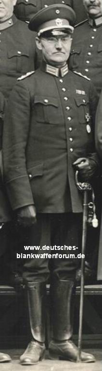 Hier möchte ich ein Thema starten, dem ich mich in den letzten Jahren ein wenig gewidmet habe: Blankwaffen der Kaiserzeit, die in der Reichswehr weitergetragen wurden. Ich bin mir sicher andere Forumsmitglieder haben auch das ein oder andere Bild beizusteuern. Zum Auftakt ein bayerischer Infanterie Säbel – ich finde das Bild ganz toll, allein schon wegen der schönen Orden..
