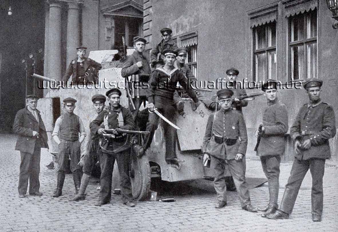 Geschichtlich irgendwo dazwischen: Meuterer vor dem Berliner Schloß am 9. November 1918. Der preußische Infanteriesäbel o/St dürfte früher einmal zur Bewaffnung eines Schutzmanns gehört haben.