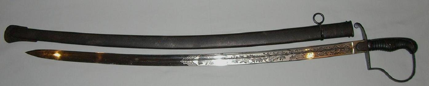 Nicht dazugehörend ist dagegen die Scheide. Diese gehört zu einem österreichischen Säbel, wahrscheinlich zu einem