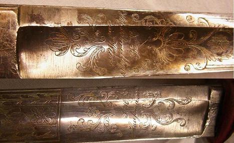 Die Klinge ist reich verziert und beschriftet: Außenseite