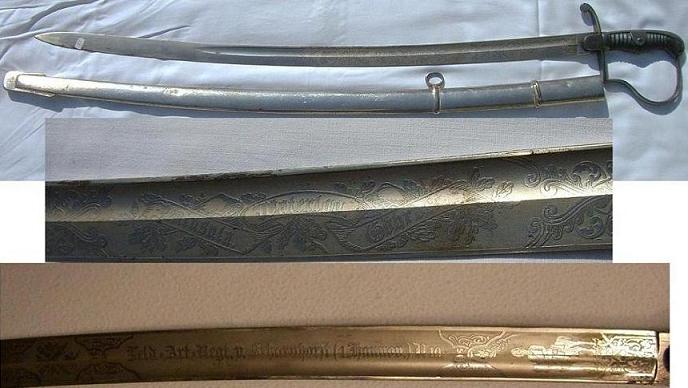 Artillerie-Extrasäbels, wenn auch schlecht erhalten. Ob er ursprünglich zu dieser Klinge gehört kann ich nicht beurteilen, obwohl mich der unterschiedliche Erhaltungszustand (Klinge-Gefäß) doch sehr verwundert. Vielleicht schlecht gelagert worden (Mit dem Griff nach unten?).