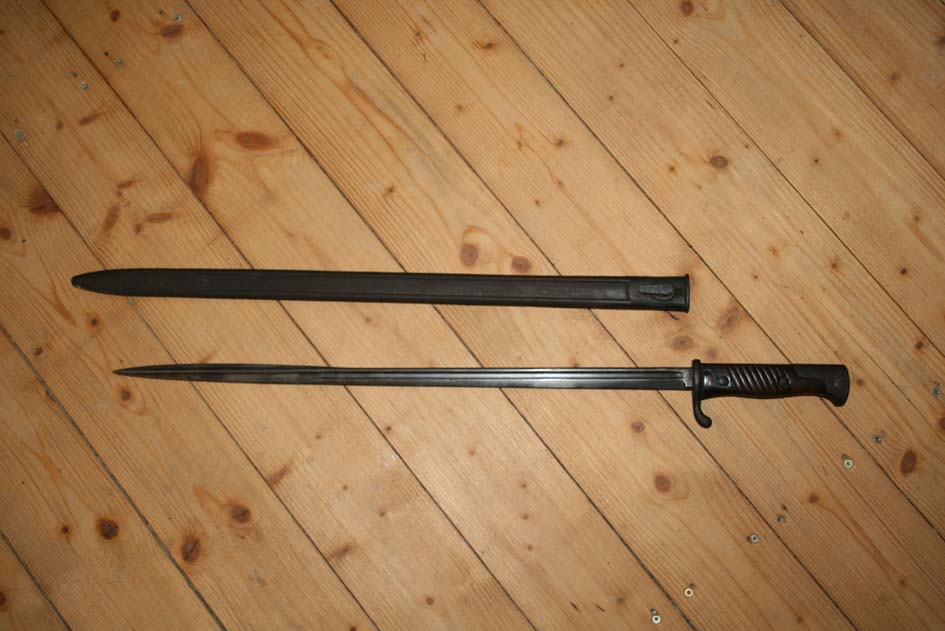 Kann mir vielleicht jemand helfen, Marke, Baujahr und Verwendung dieses Bayonetts zu bestimmen? Ich habe mal bei Wikipedia nachgelesen, kann damit aber nicht wirklich viel anfangen. Das Bayonett ist ein Erbstück und ich könnte mir vorstellen, dass es im 2. Weltkrieg verwendet wurde. Die Gesamtlänge (mit Scheide) beträgt 69 cm!