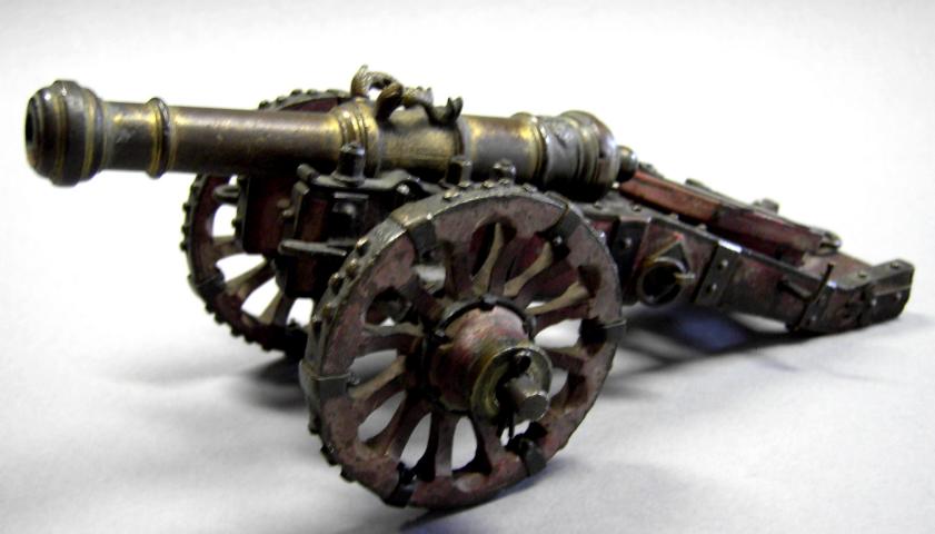 Egal, mir gefiel die Form des Rohres und obwohl es mit grauer Farbe gestrichen war, konnte man sehen, dass es aus Messing ist. Die Lafette, ebenso gestrichen, sah von der Form auch ganz gut aus. Die Räder hatten zwar einen eisernen Radreifen, waren aber einfach etwas eiförmige Holzscheiben. Die Rohrbefestigung ist für eine Kanone auch etwas kurios. Beschuss- oder Herstellerzeichen sind keine vorhanden.