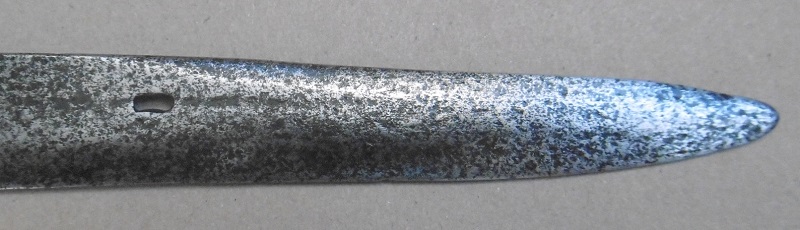 Als Besonderheit hat Dieser Hirschfänger rund 10 cm vor der Spitze noch einen rechteckigen Durchbruch von 6 mm Länge und 2mm Breite. Ich könnte mir vorstellen, dass es dazu diente eine Schnur oder ähnliches irgendwo durchzufädeln. An einem Hirschfänger habe ich so etwas jedenfalls noch nicht gesehen. Vielleicht gibt es ja noch andere Ideen. Wenn ja, dann raus damit!