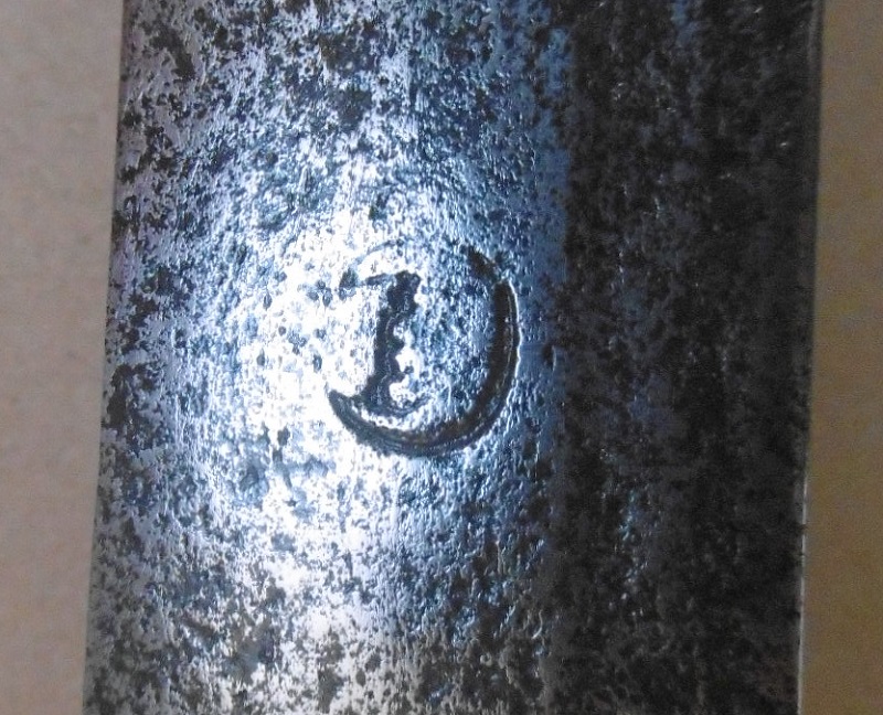 Die Klinge hat nahe des Rückens beidseitig eine schmale Kehle, wobei sie quartseitig nur noch zu erahnen ist. Terzseitig weist die Klinge eine schöne Halbmondmarke auf wie sie im 16./17. Jahrhundert in Mode war. Diese Art Marken finden sich gerne auf spanischen Klingen jener Zeit aber wohl auch auf welchen aus Mailand. Ich denke, dass diese Marke ähnlich wie der Passauer Wolf, auch von anderen Schmieden geschlagen wurde.
