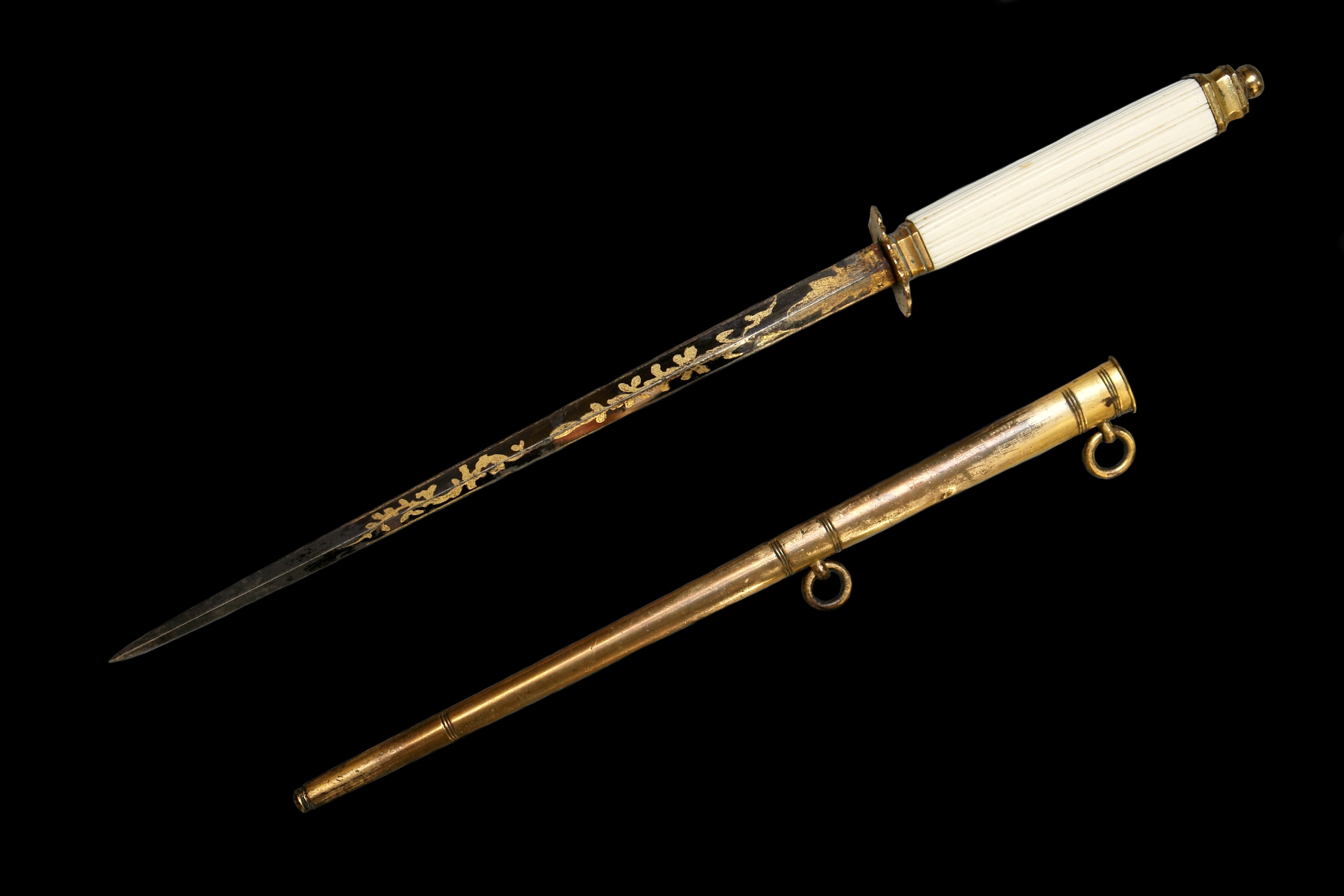 Der Elfenbeingriff und die Ausführung der Scheide (mit Resten einer Vergoldung), lassen an eine Verwendung bei der Marine denken, obwohl keinerlei maritime Symbole, wie Anker etc. vorhanden sind. Bei dem Dekor der gebläuten und vergoldeten Klinge gibt es Ähnlichkeiten mit französischen Klingen aus dem ersten Drittel des 19ten Jahrhunderts.