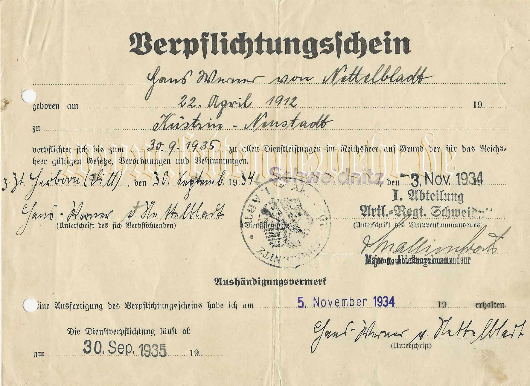 Der Verpflichtungsschein zur einjährigen Dienstleistung im Reichsheer 30. September 1934 für Hans-Werner von Nettelbladt. Ungewöhnlich ist hierbei sein Aufenthaltsort "zum Zeitpunkt Herborn (Dill)" und der weit entfernte Dienstort Schweidnitz in Schlesien.