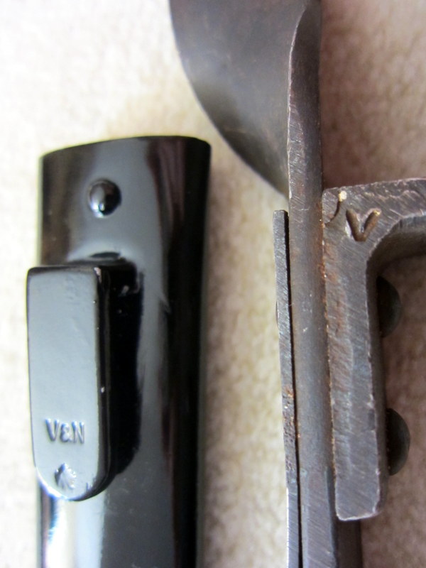 Klinge aus Bandeisen, 1 seitig schneidig, Mittelspitze 2 schneidig, Bohrungsdurchmesser 15 mm, Arretierung durch Blattfeder, gestempelt V und Scheide mit V&N gestempelt.