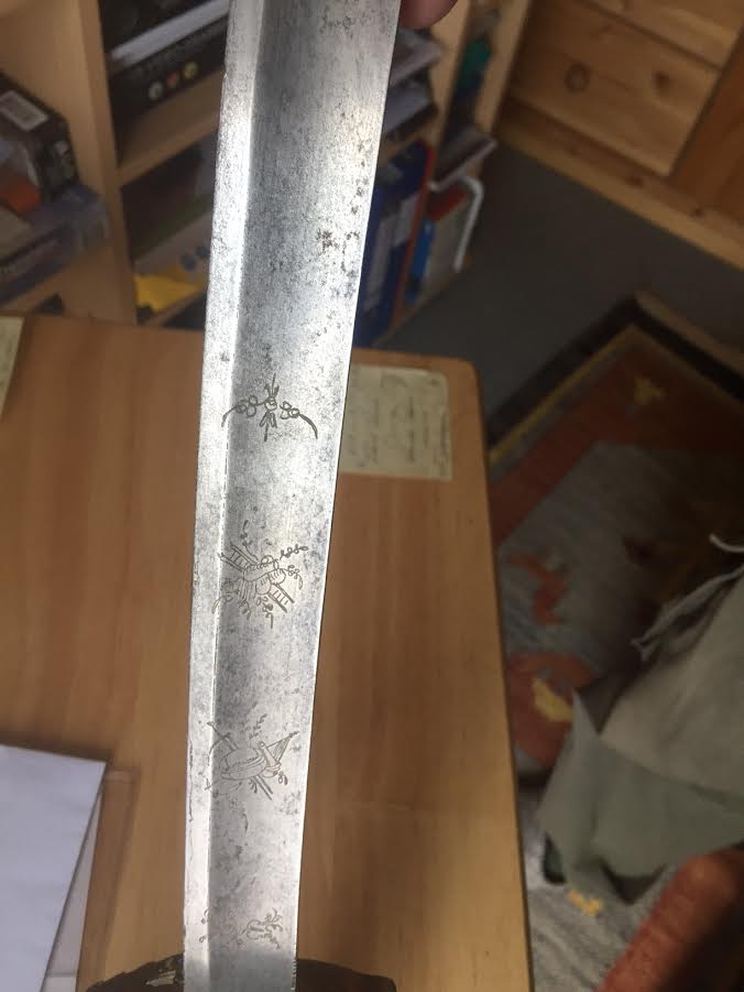 Und hier der angekündigte Säbel Nr. 2. Er erscheint etwas größer als der erste. Auf der Klinge sind verschiedene "Ornamente" abgebildet, der Handschutz ist als preußsischer Adler (?) ausgeformt.