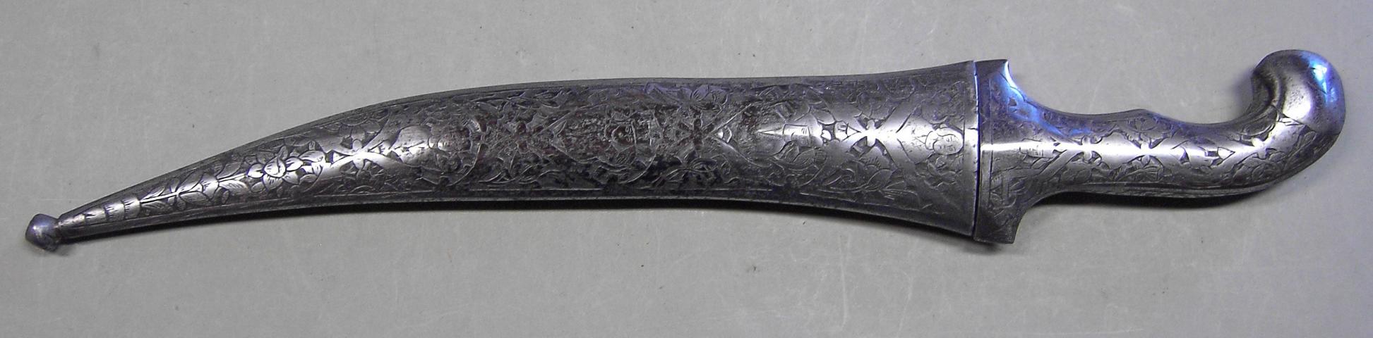 Der recht große Khanjar ist ein typisches Stück aus der mittleren Qajar-Periode Persiens (1795-1925) und besteht aus magnetischem Eisen. Griff und Scheide sowie die Klinge sind großflächig dekoriert.