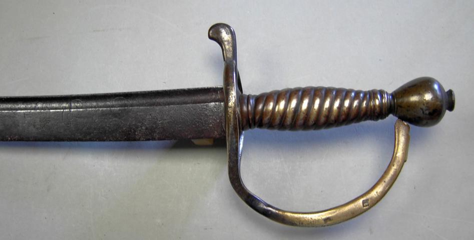 Gegossenes Ganz-Messinggefäß mit diagonal gerippter Hilze, oberem und unterem Griffring und urnenförmigem, im Querschnitt rundem Knauf mit Vernietknäufchen. Herzförmiges Stichblatt mit Mittelrippe und ortwärts gebogenem Parierstangenende. Rund gebogener, vom Stichblatt zum Knauf verlaufender Handbügel mit Stempel „NB“ im Quadrat an der Quartseite. Gebogene Rückenklinge mit beidseitigem Zug unter dem Rücken und Ort in der Rückenlinie. Quartseitig das Klingenmonogramm „CF“ unter Fürstenhut, terzseitig Reste des großen, badischen Staatswappens. Truppenstempelung „:N:5:“ am quartseitigen Stichblatt.