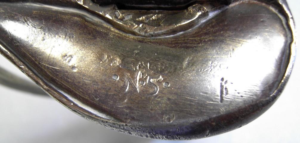 Gegossenes Ganz-Messinggefäß mit diagonal gerippter Hilze, oberem und unterem Griffring und urnenförmigem, im Querschnitt rundem Knauf mit Vernietknäufchen. Herzförmiges Stichblatt mit Mittelrippe und ortwärts gebogenem Parierstangenende. Rund gebogener, vom Stichblatt zum Knauf verlaufender Handbügel mit Stempel „NB“ im Quadrat an der Quartseite. Gebogene Rückenklinge mit beidseitigem Zug unter dem Rücken und Ort in der Rückenlinie. Quartseitig das Klingenmonogramm „CF“ unter Fürstenhut, terzseitig Reste des großen, badischen Staatswappens. Truppenstempelung „:N:5:“ am quartseitigen Stichblatt.