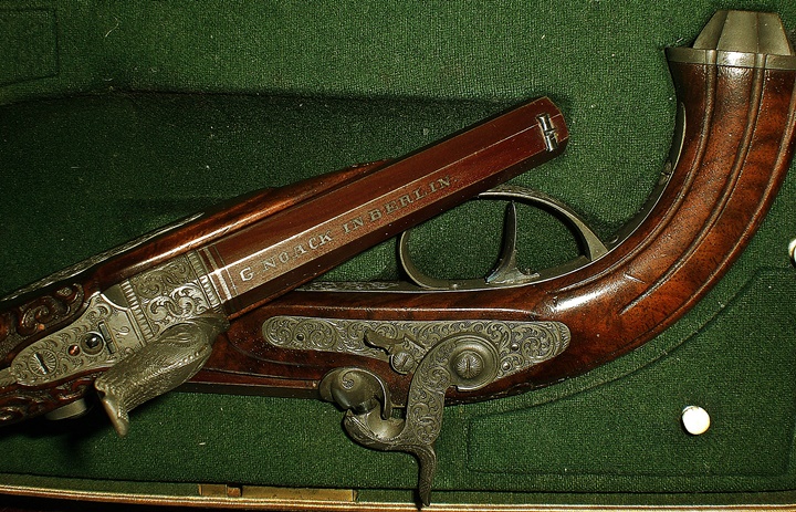 Beide Pistolen, mit 8 kantigen, gebräunten und gezogenen Läufen. Hersteller " NOACK BERLIN, " beide P. sind mit der Nummerierung 1 + 2 versehen. Die Kimmen sind verstellbar, selbst die " kleinen " Stifte zur Einstellung sind gebläut und wurden nie benutzt!D Beide Waffen sind vermutlich außer zum Funktionsbeschuss, nie beschossen.