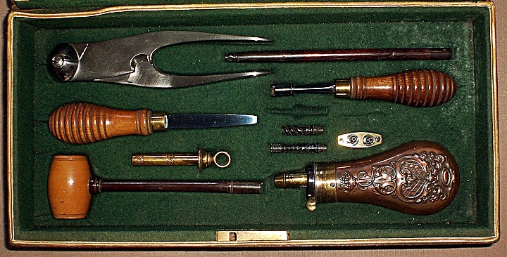 Die obere Aufnahme des Kastens, für die beiden Pistolen, dann ein Fach für Kugeln, eins für Putzwolle. Im unteren Fach die aus Kupfer gefertigte, " Herzförmig " verzierte Pulverflasche, dazu das original Werkzeug, alles orig. gebläut. Ein Teil fehlt, weiß leider nicht wie es ausgesehen hat!