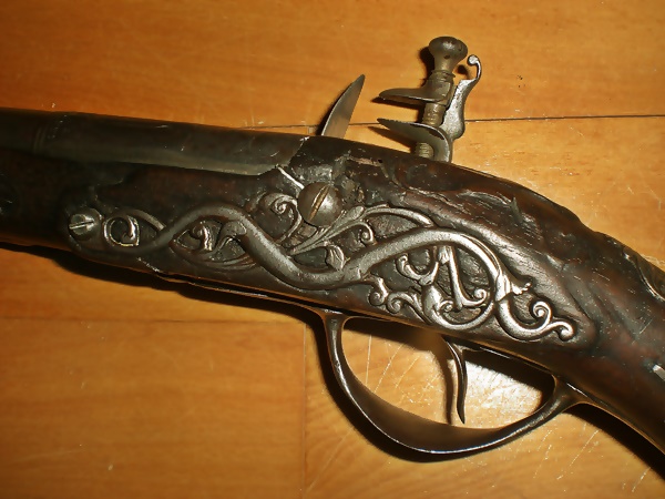 vielleicht kann mir jemand bei der Zuordnung dieser frühen Steinschlosspistole, mit eiserner Garnitur helfen.