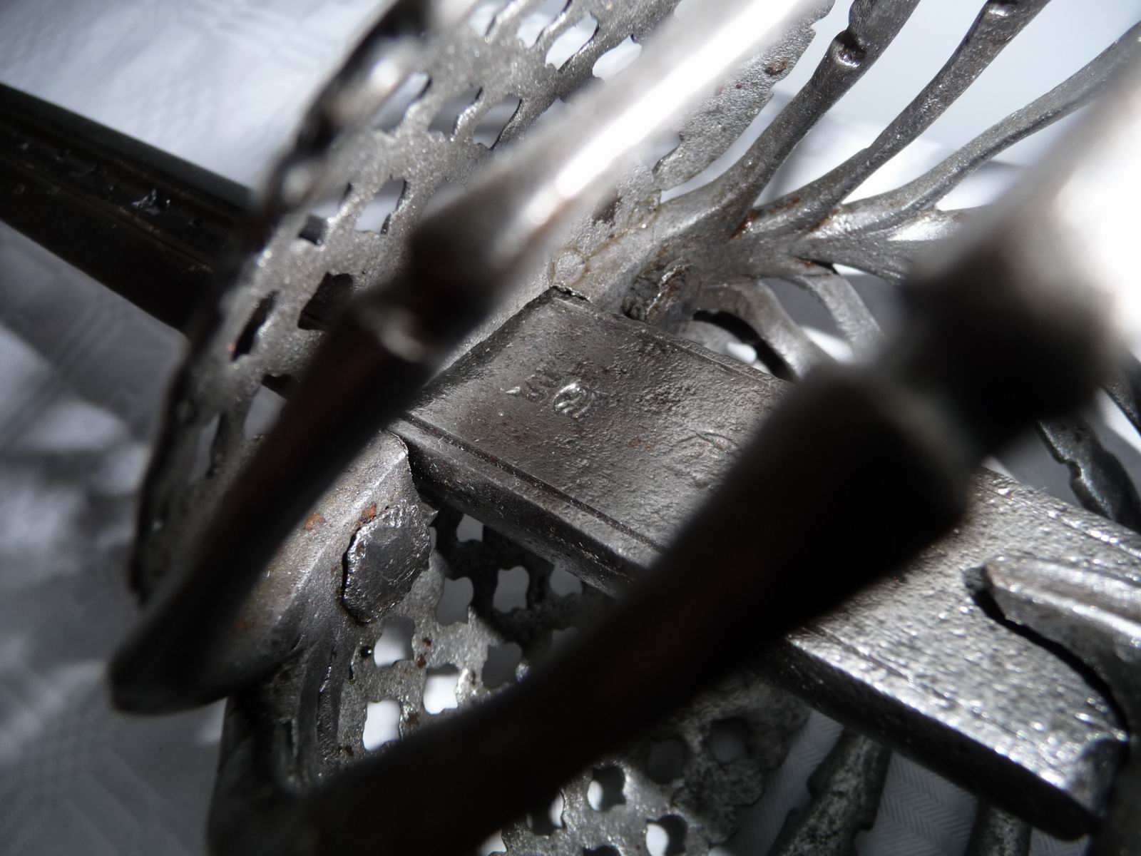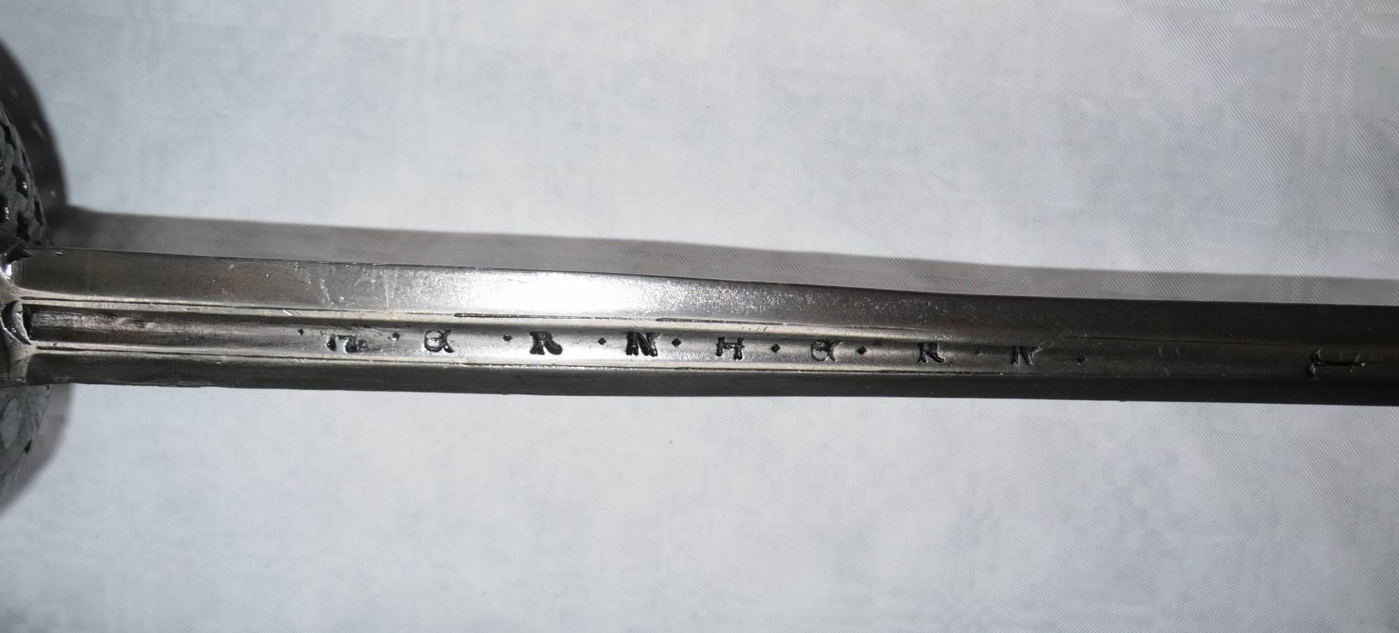 Klinge mit einigermaßen deutlichen Marken auf dem offenen Angelbereich. Klinge mit Inschrift. Korb im Design ähnlich Fingergelenksknochen.