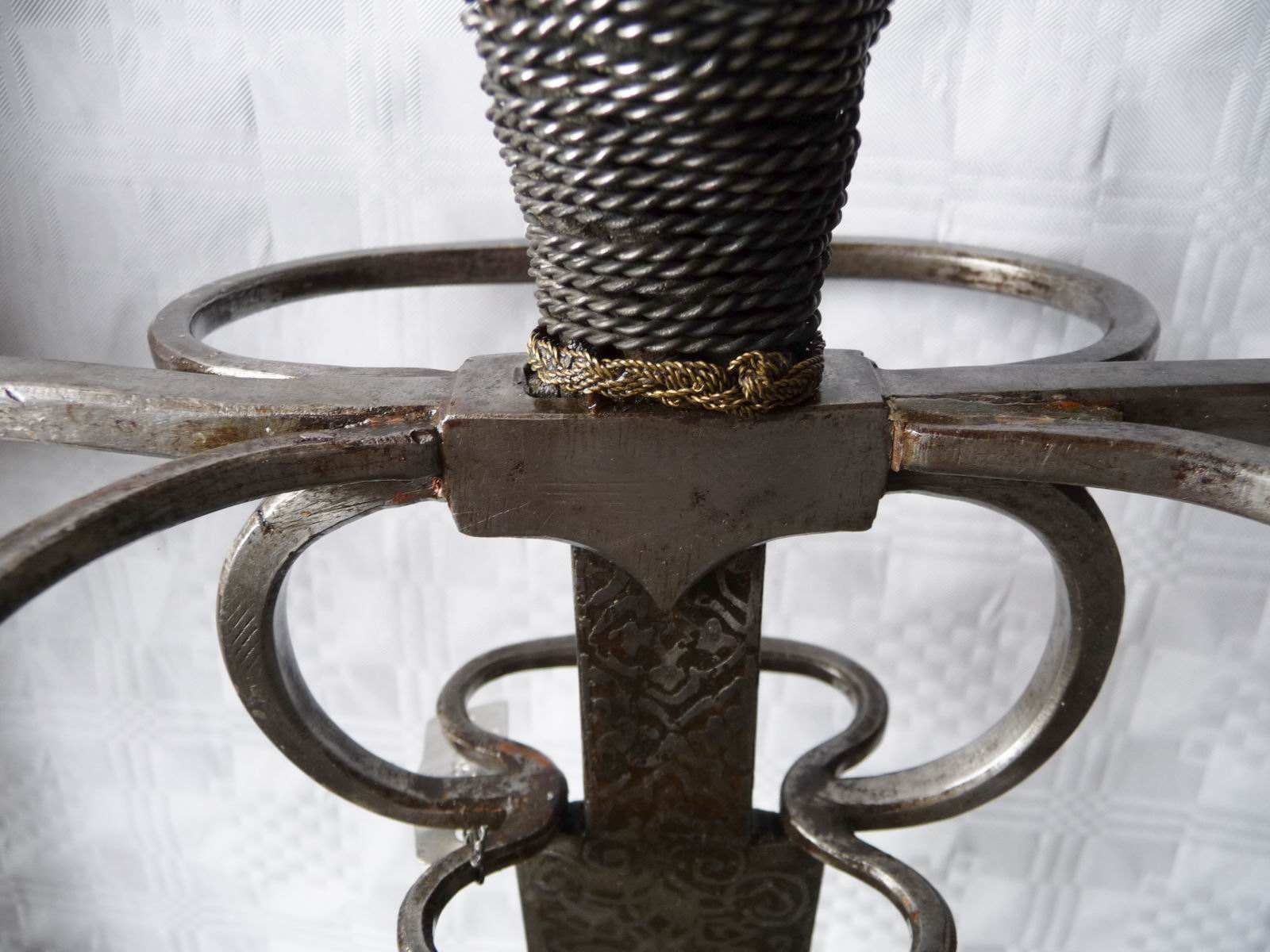 Auch diese Waffe ist überschwer, was meines Erachtens die Zuordnung als Historismusstück oder gar Fälschung aus der ersten Hälfte des 20. Jahrhunderts möglich machen könnte. Weiterhin meine ich Messinglot-Spuren in einigen Bereichen zwischen Parierstange und den Nebenbügeln zu erahnen, siehe rote Kreise letztes Foto.