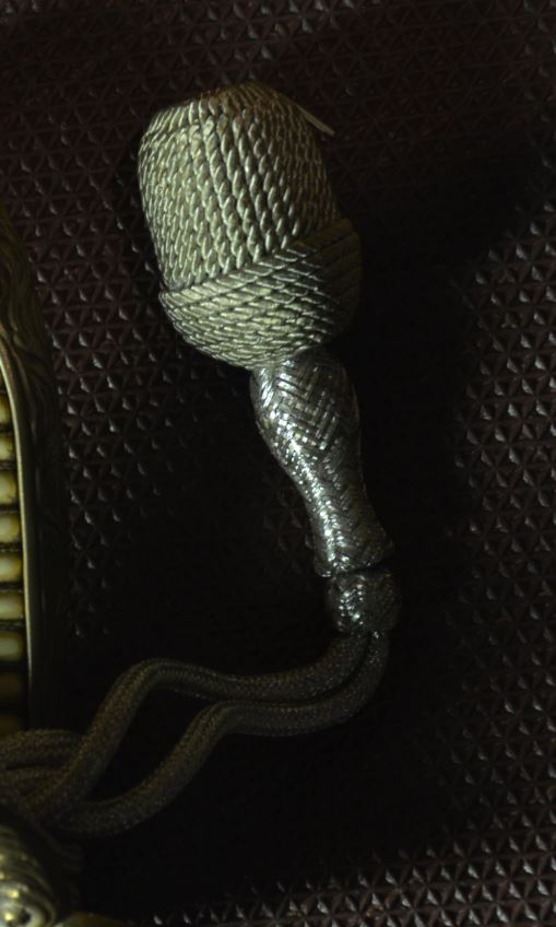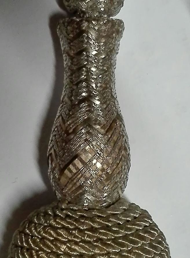 muß euch nochmals wegen dem Portepee bemühen. Meine Frage war ja auch nach Maße (i.etwa)eines Portepees für einen Säbel der Reichsmarine. Dieser hier ist in der Farbgebung sehr unterschiedlich. Die Troddel hat eine ladenneues silbernes Ausehen, ebenfals der Schieber und Stengel, keinerlei mechanische Abnutzung. Die Eichel hat die Größe wie beim MOD ist aber silbermatt. Ich bin der Meinung, hier wurde gebastelt. Das letzte Bild zeigt ein Portepee eines Herstellers von Vereinsartikel. Neben der schlampigen Verarbeitung am Stengel sehe ich hier eine große Ähnlichkeit zum Vereinsportepee. Länge des Portepees 45cm.