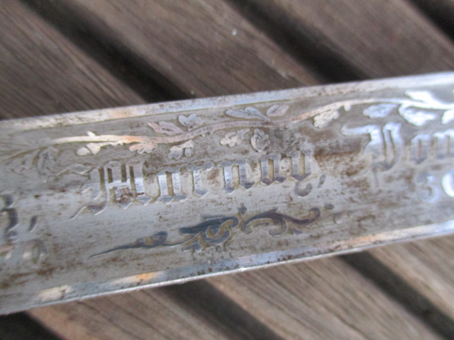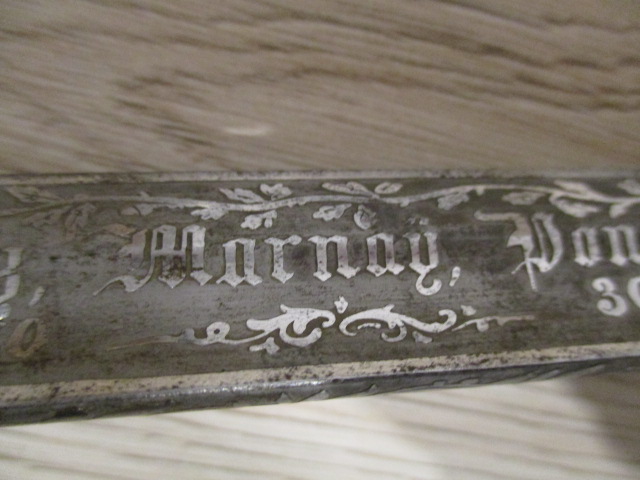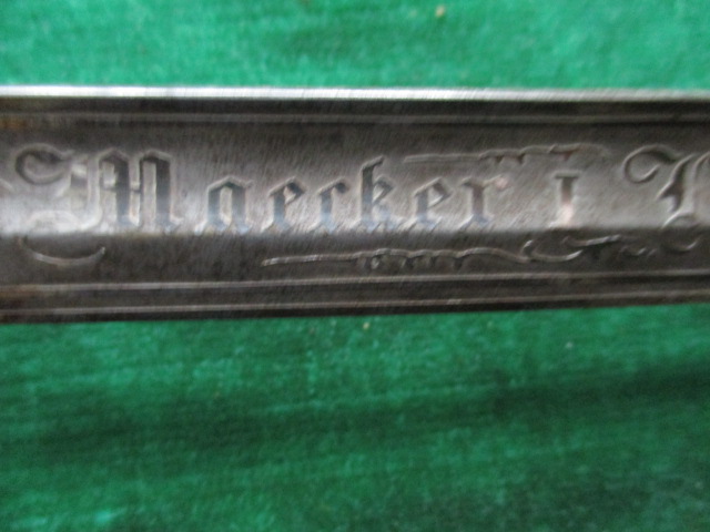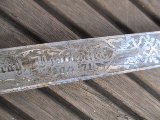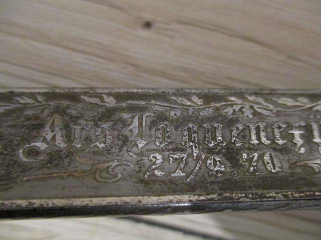 auf einer Seite der Klinge steht "Maecker I Lieutenant" auf der anderen Seite stehen 7 Ortschaften/Kriegsschauplätze mit Datums des Deutsch/Französischen Krieges 1870/71