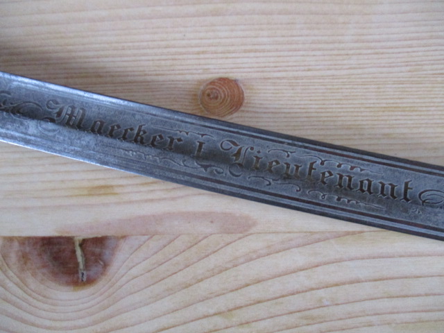 auf einer Seite der Klinge steht "Maecker I Lieutenant" auf der anderen Seite stehen 7 Ortschaften/Kriegsschauplätze mit Datums des Deutsch/Französischen Krieges 1870/71