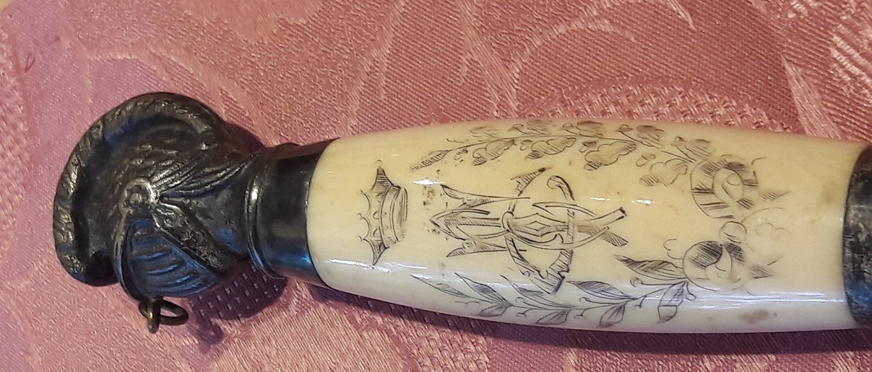 Sehr reich verziert, kommt auf den Fotos leider nicht so rüber. Laut Gravur sollte das einem ?.?. Turner gehört haben (oder von ihm hergestellt worden sein). Ich sehe ausserdem noch einen Hinweis "New York" - hat das was zu bedeuten? Auch der Griff scheint ein besonderes Material (Elfenbein?) zu sein? Selbst die Scheide ist sehr reich verziert und schön gestaltet.